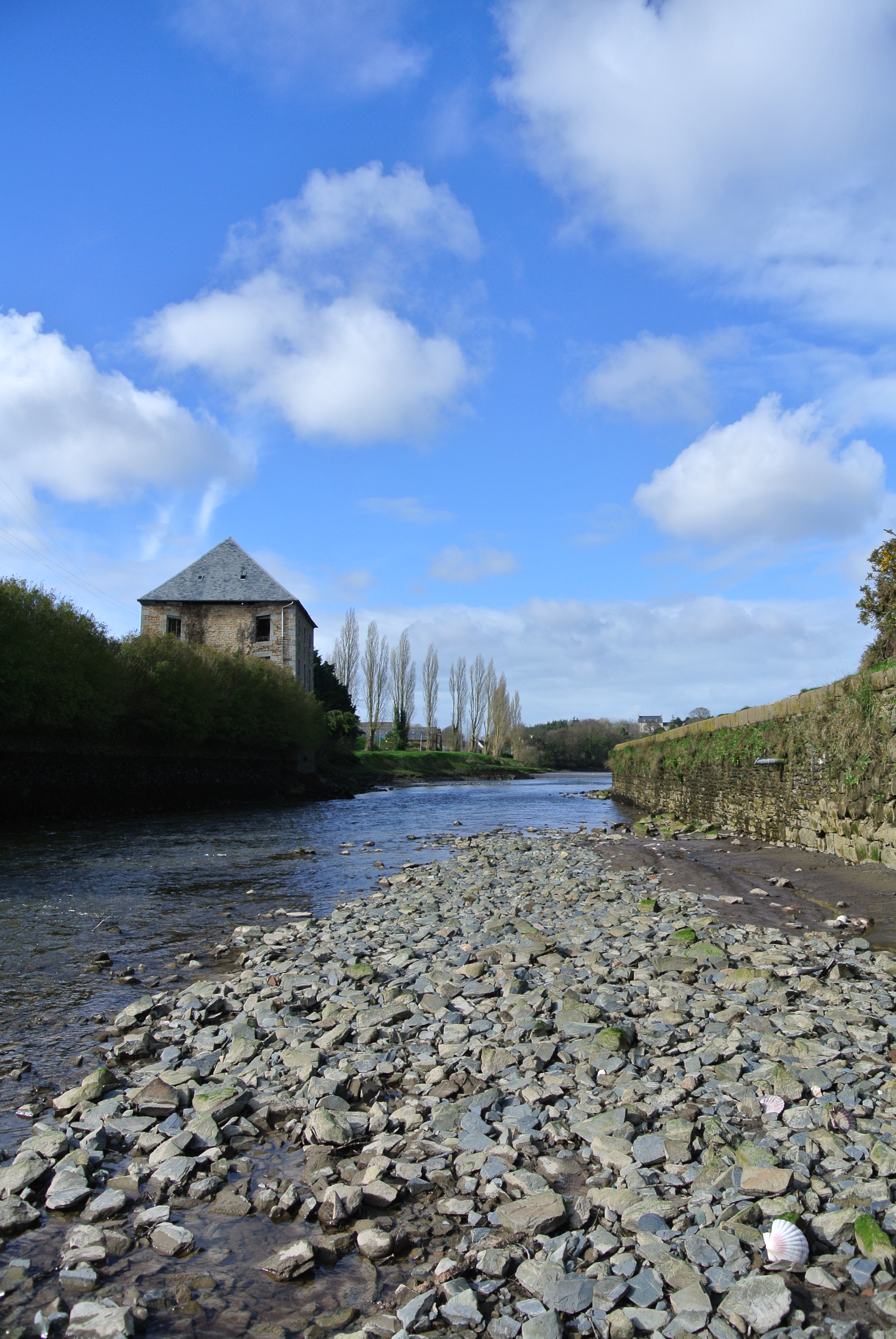 Ancien port de La Roche-Derrien. Mur de quai vu du lit de la rivière à marée basse. Vue généale estImmatriculation