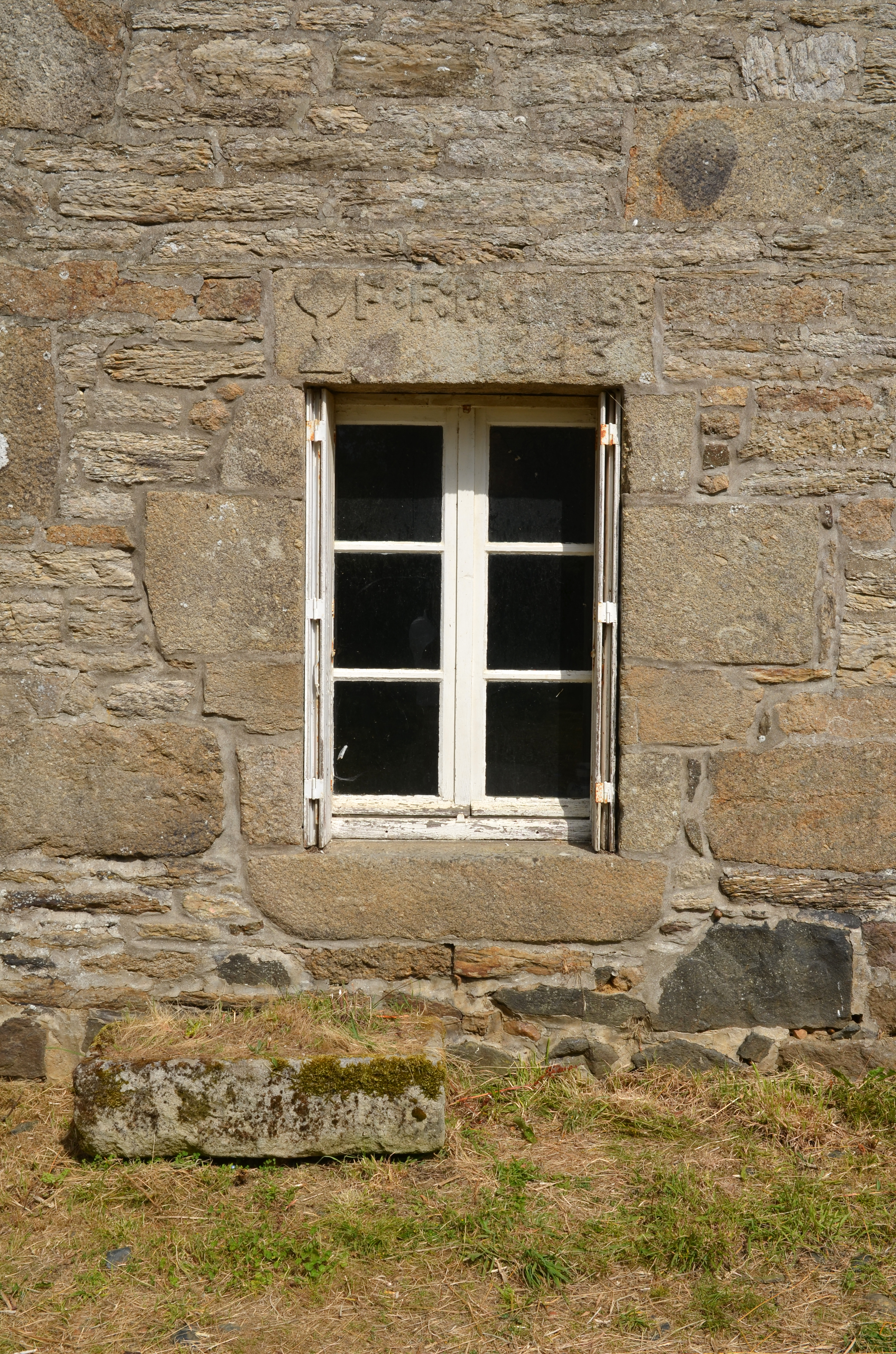 Trémel, Kerdudavel : manoir, détail de l'avancée, le linteau de la fenêtre porte le millésime et l'inscription suivante : "[calice] ; F. F. P. M: H: B: R / 1643". Le calice pourrait indiquer qu'il s'agissait d'un logement de prêtre ou d'ecclésiastiqueImmatriculation