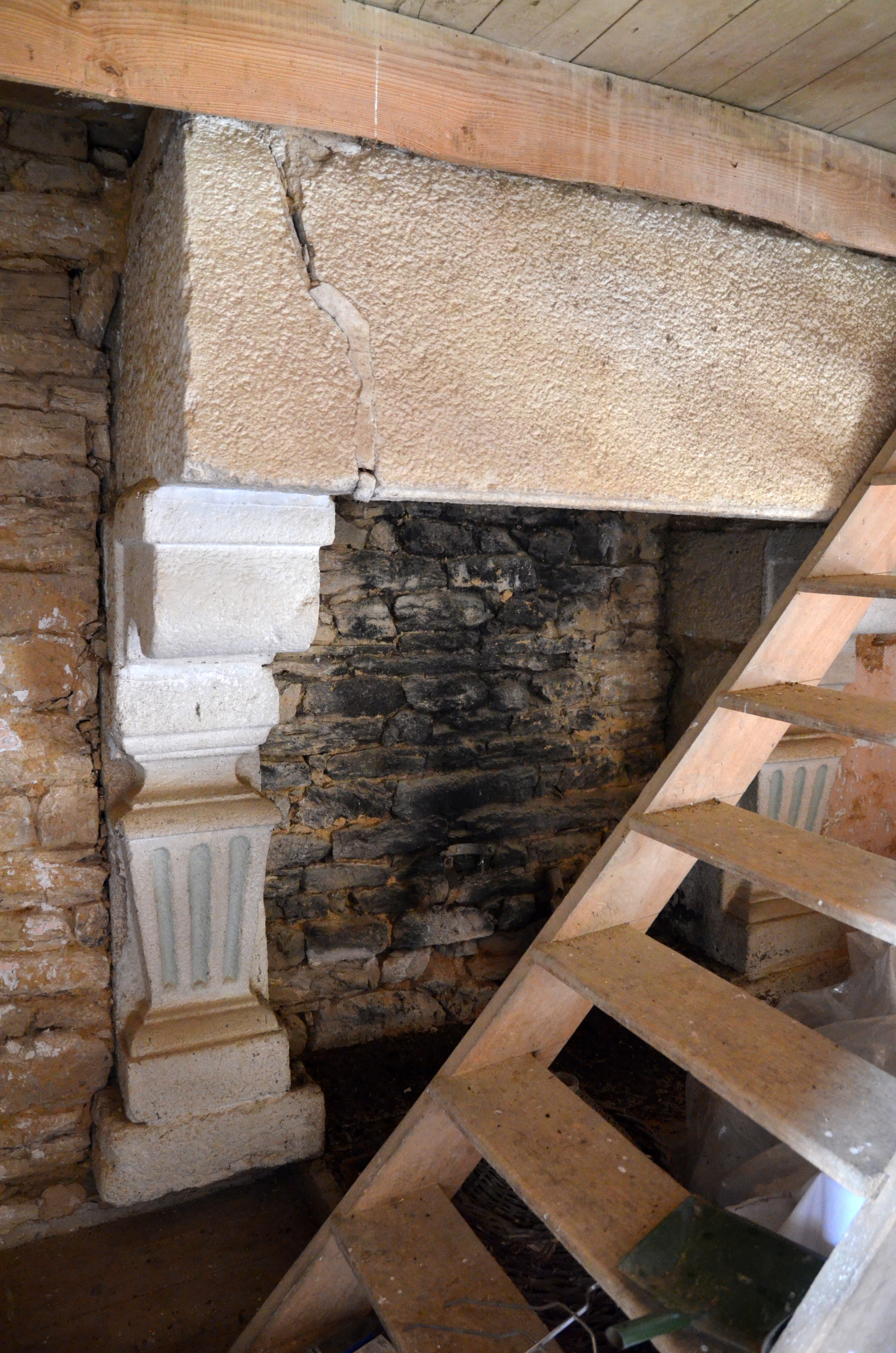 Trémel, Kerdudavel : manoir, vue intérieure, chambre haute, détail de la cheminée. Cette cheminée à cannelures est vraisemblablement datable des années 1620-1640Immatriculation