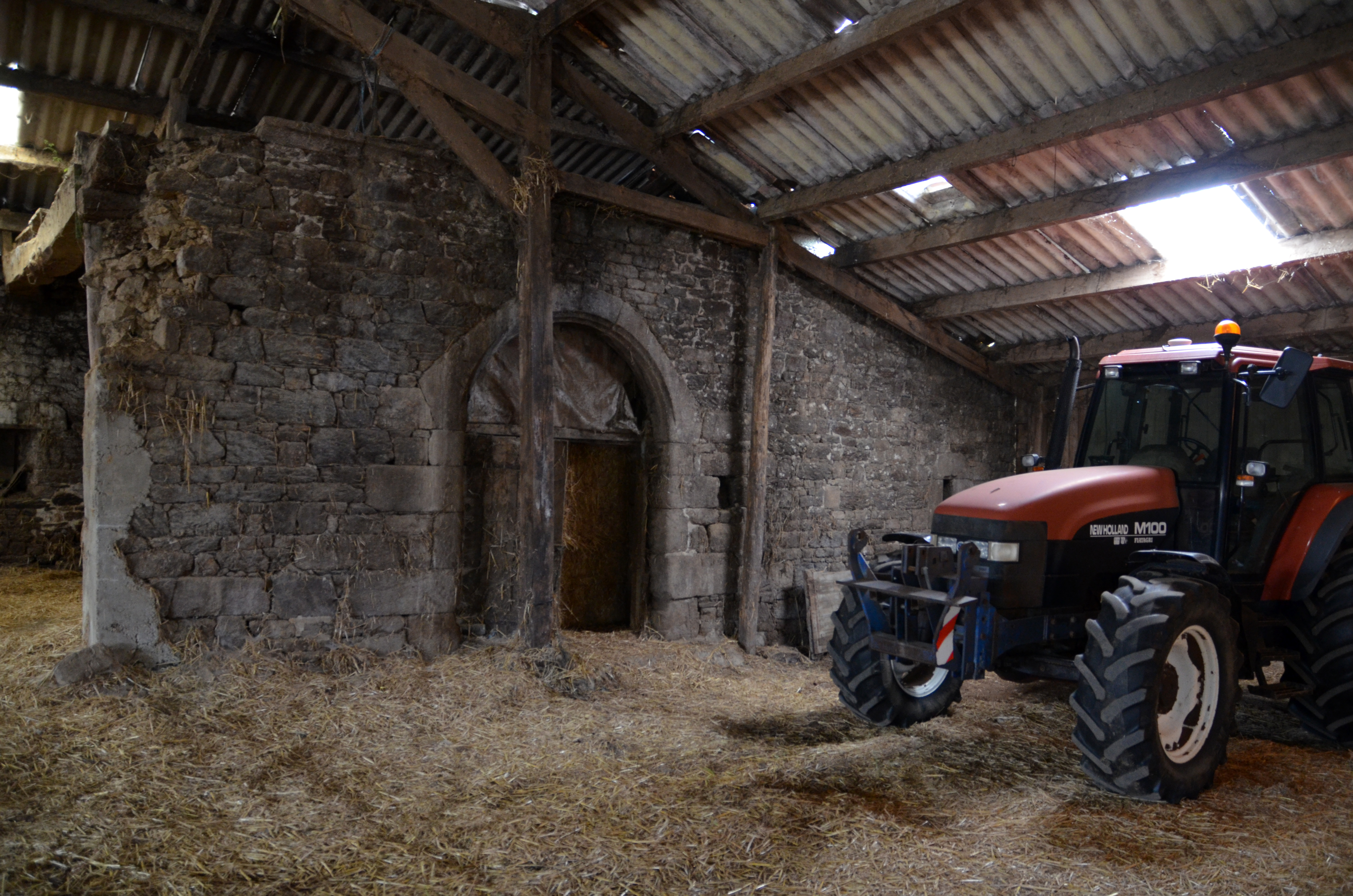 Trémel, Kergavarec : ferme, vue intérieure du hangar agricole, dépendance à usage de grange datable du 17e siècleImmatriculation