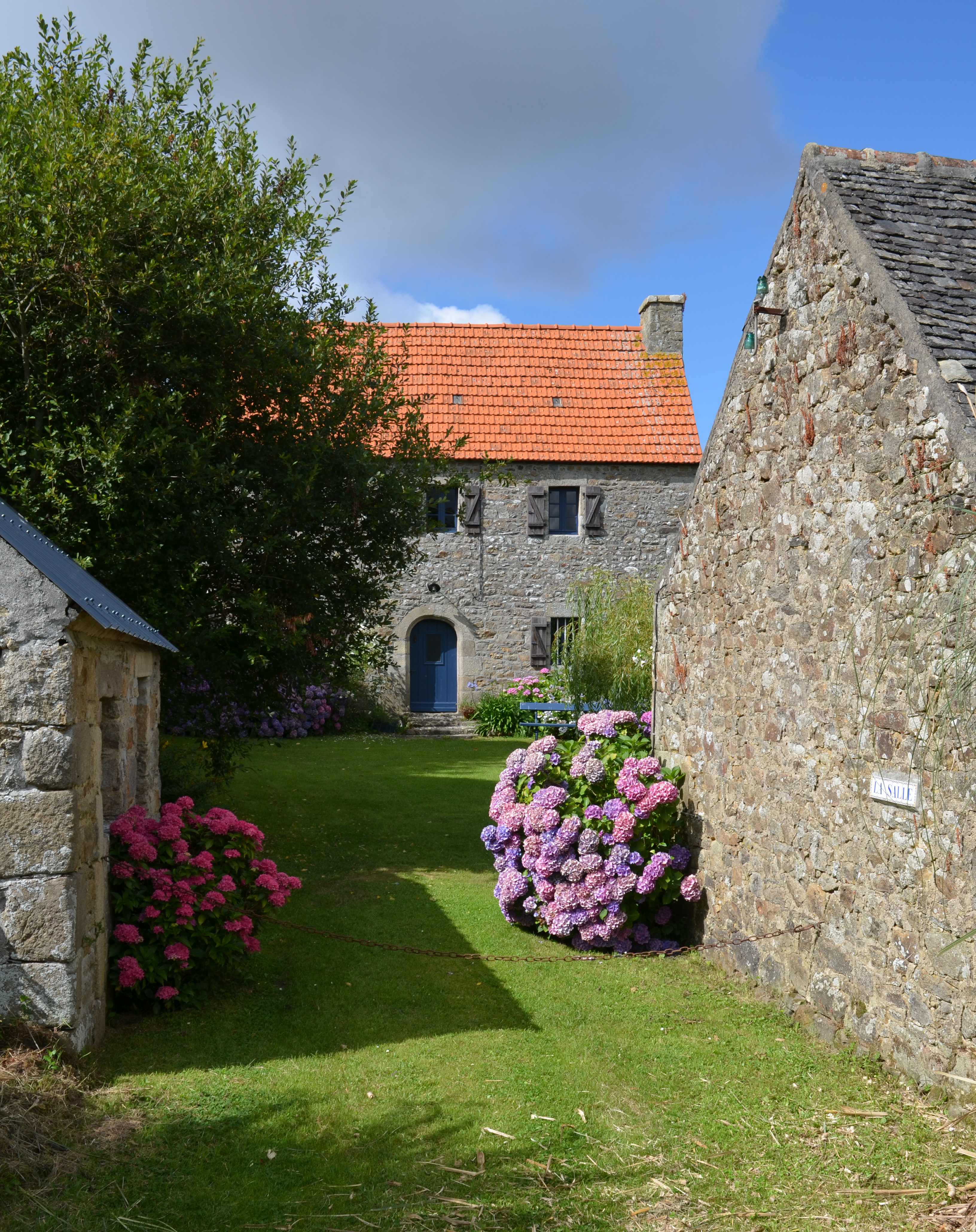 Trémel, la Salle : ferme, élévation antérieure orientée vers le sud-sud-ouest. Cet édifice est datable du 17e siècle (porte moulurée en arc plein cintre, petites fenêtres rectangulaires...)Immatriculation