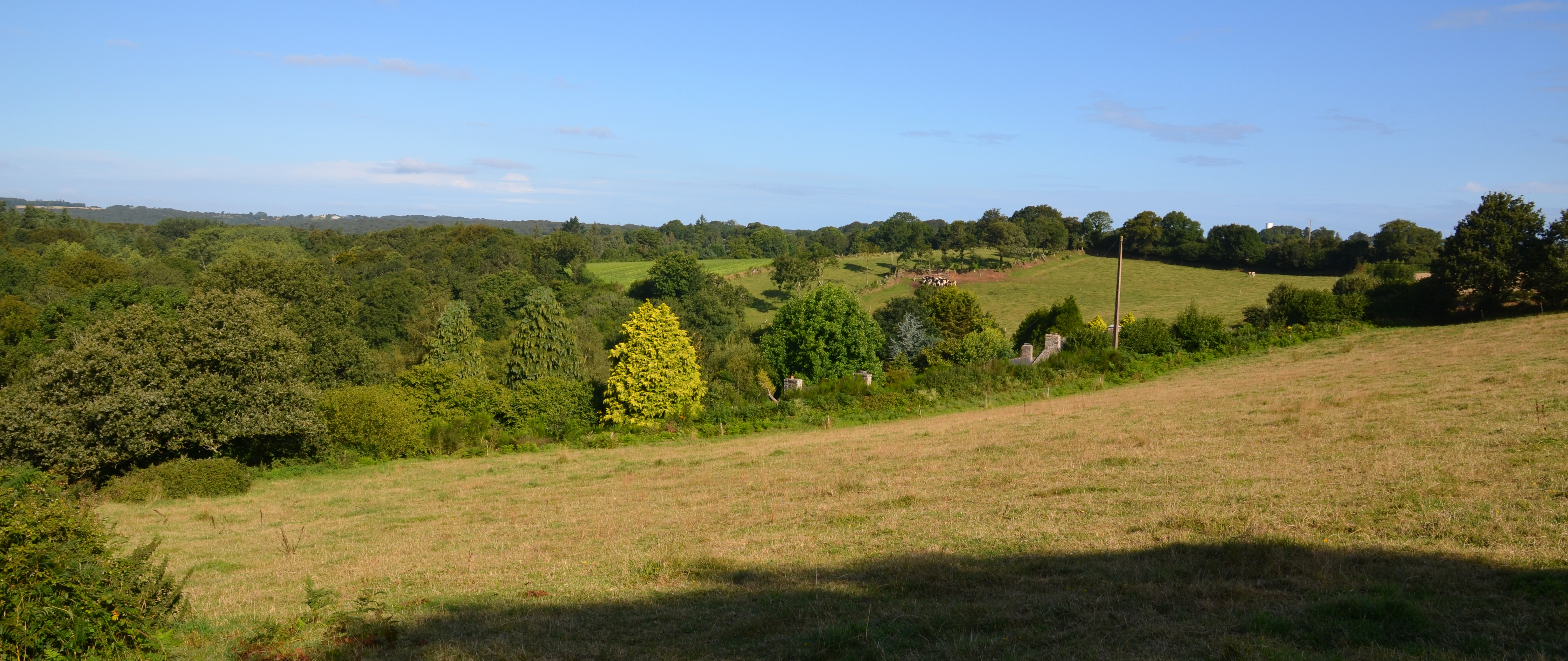 Trémel, Le Traon - Le Val : vue paysagère. L'habitat est protégé par le relief des vents d'est et du nordImmatriculation
