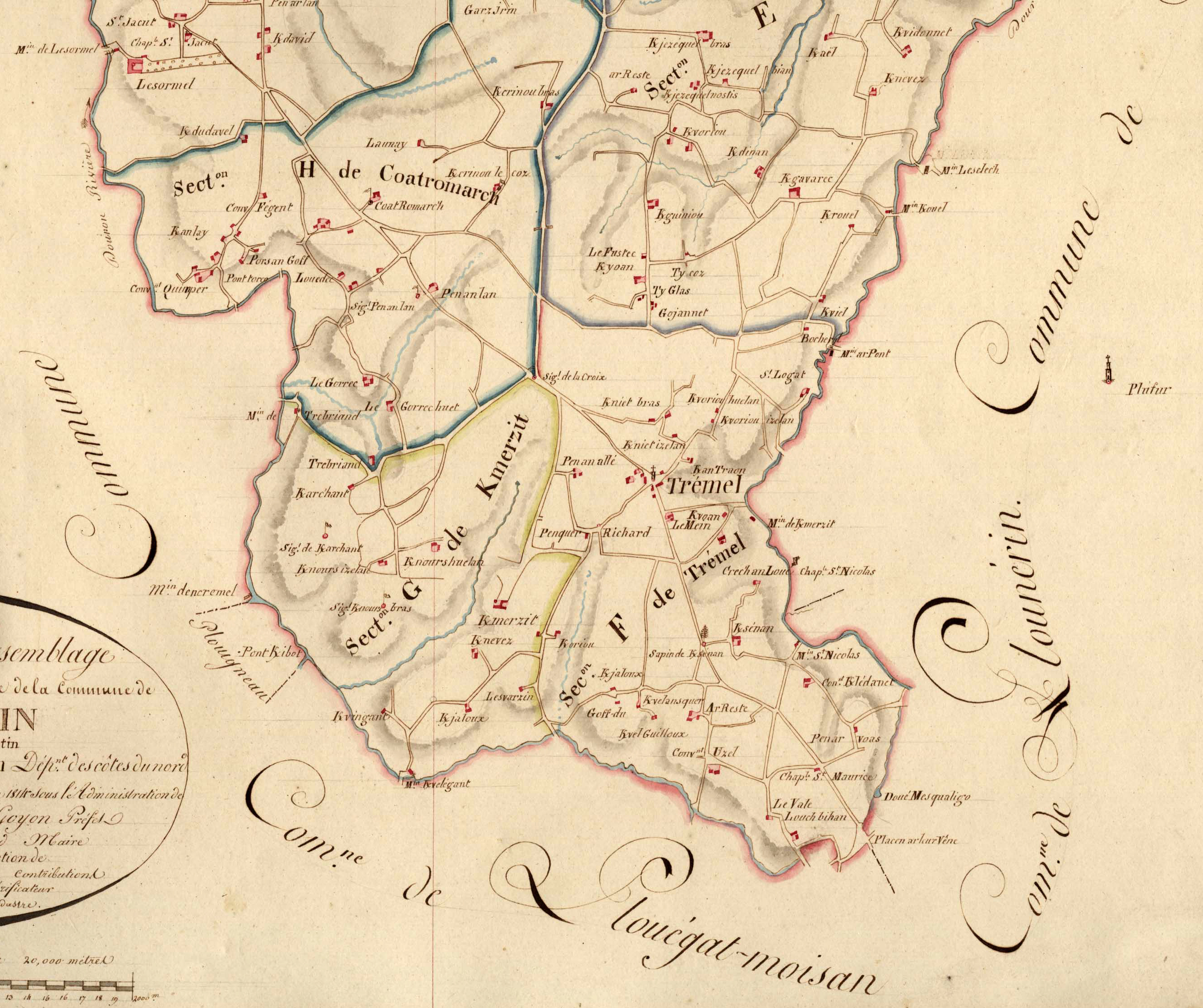 Extrait du tableau d'assemblage du cadastre ancien de la commune de Plestin, 1814 : Trémel est une trève de la paroisse de Plestin. Trémel était composée des frairies de Trébriant, de Trémel et de TrédillacImmatriculation