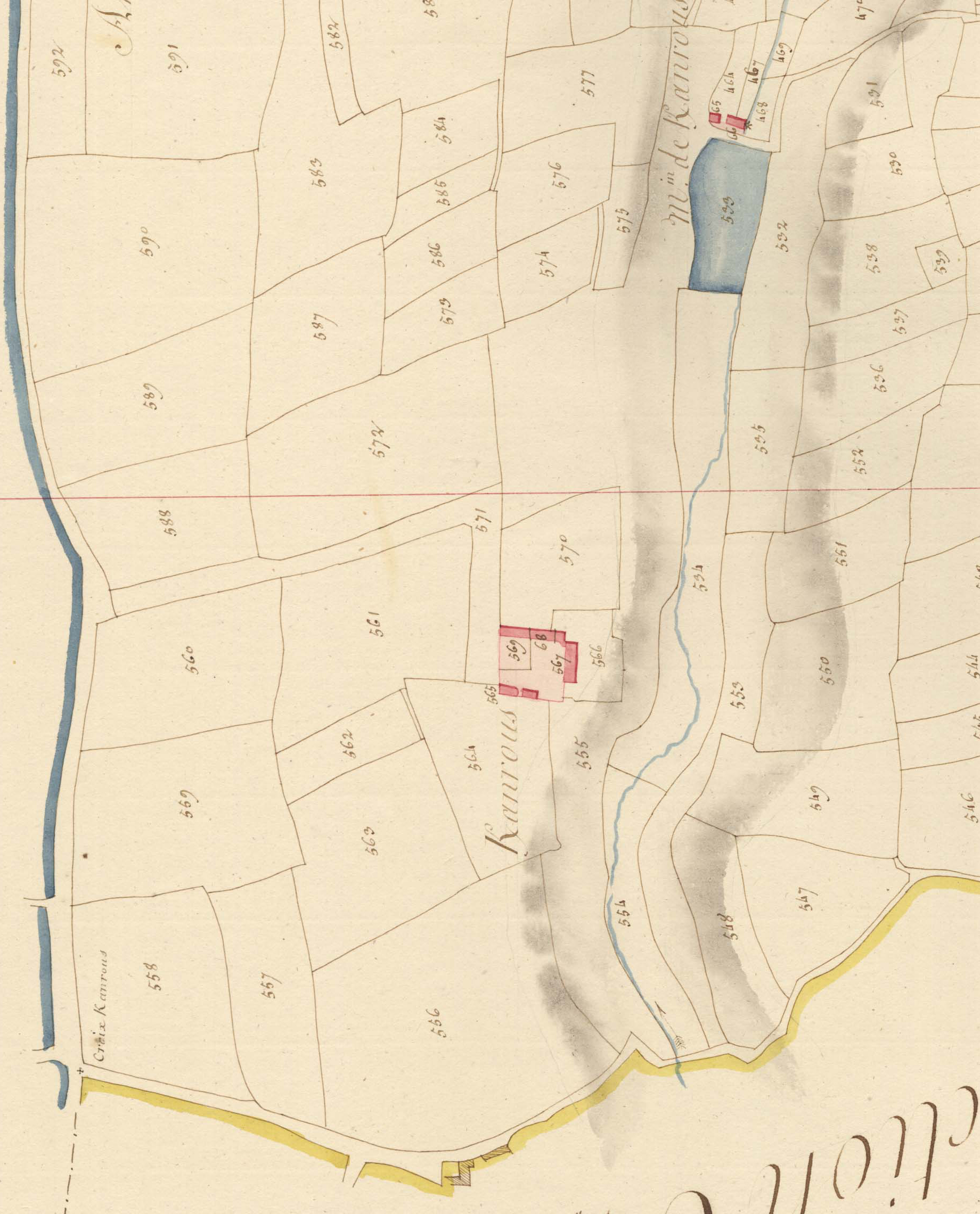 Extrait du cadastre ancien de la commune de Plufur, 1816 : Keranroux (avenue, manoir, métairie, étang et moulin à eau)Immatriculation