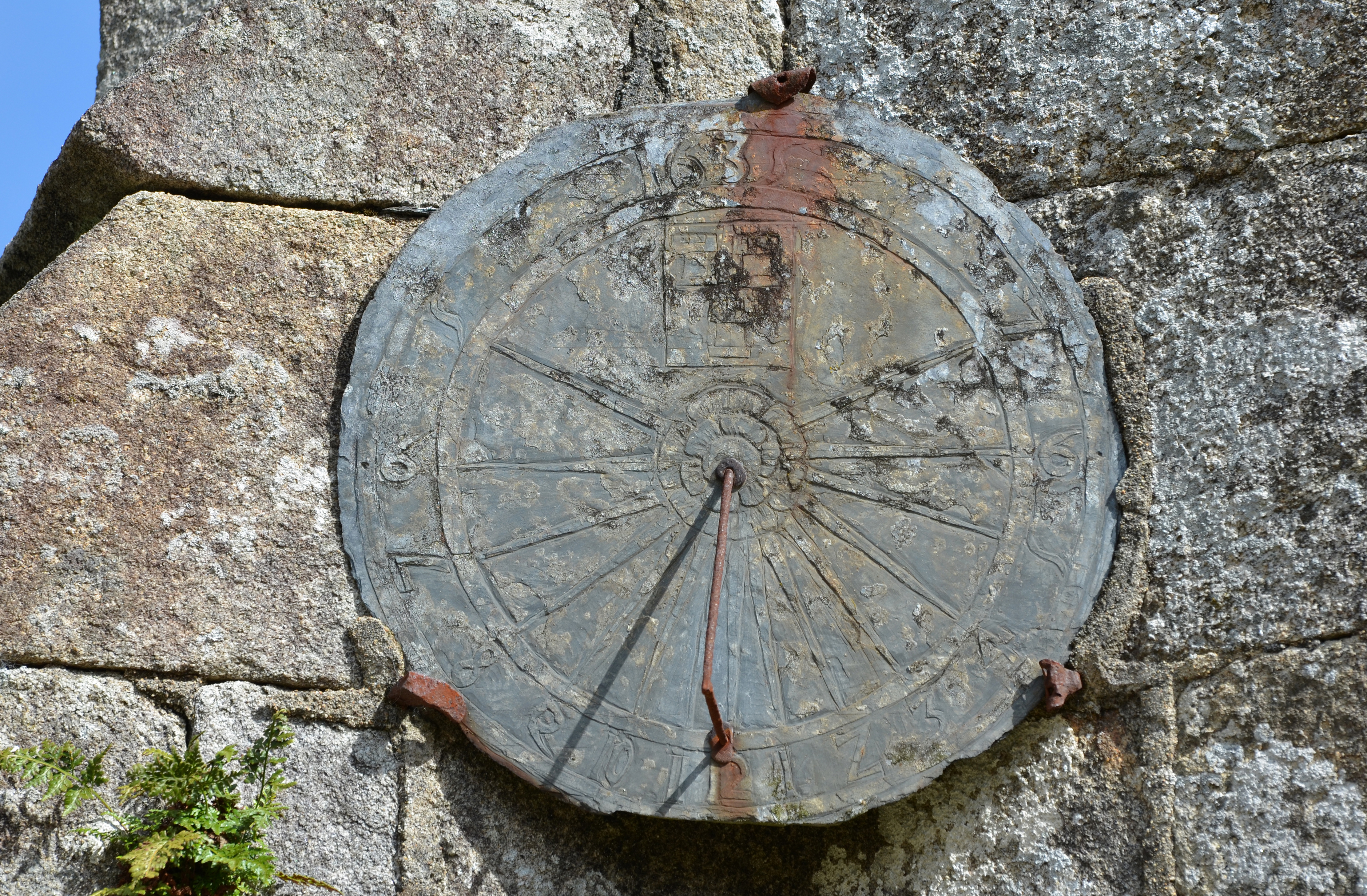 Trémel, le bourg : église paroissiale Notre-Dame, porche sud, détail du cadran solaire en schiste daté de 1635Immatriculation