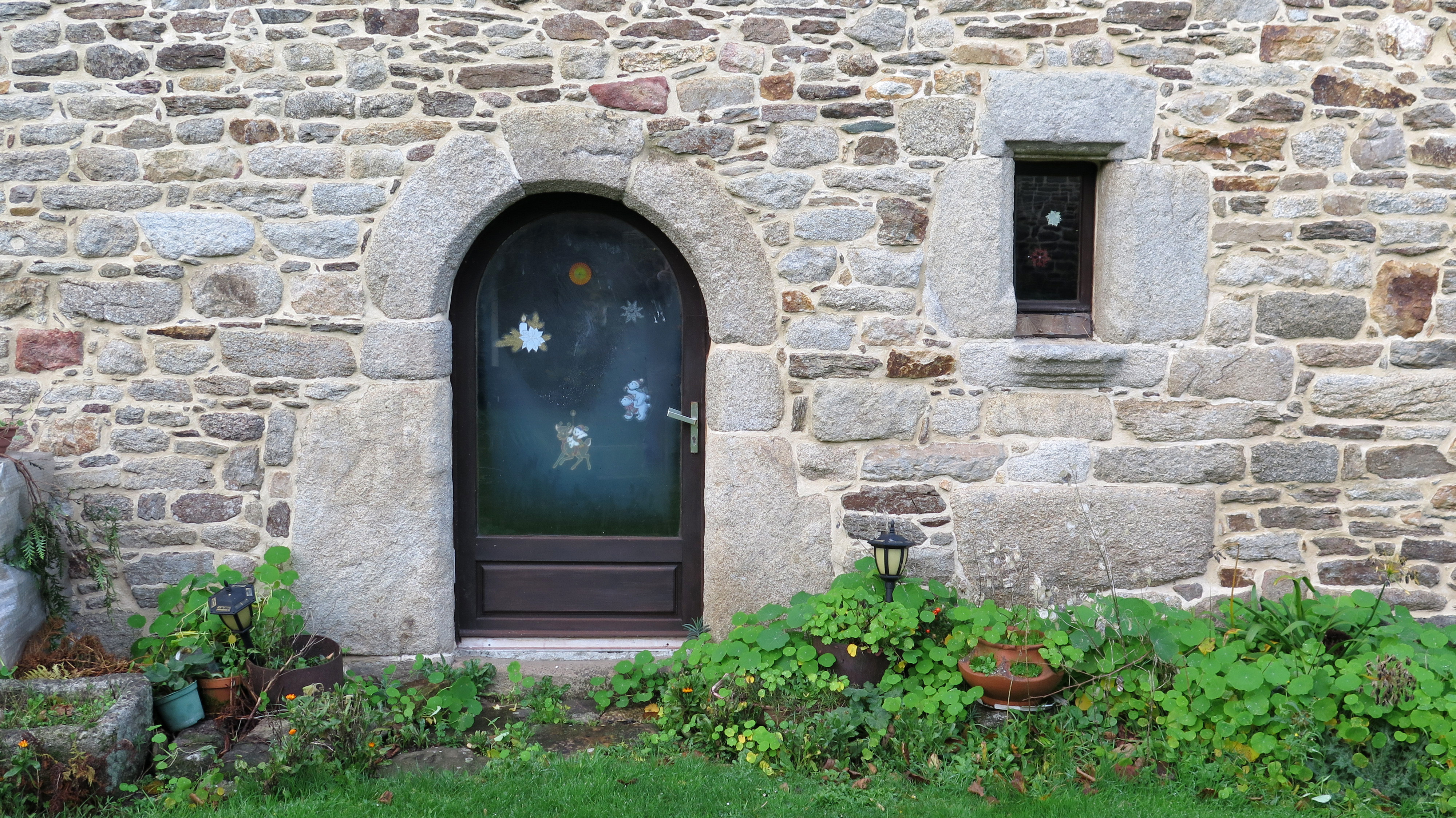 Plufur, Guern ar Hastel : manoir, détail de l'élévation orientée vers le sud-sud-est, porte en arc plein cintre, fenêtre à appui saillant du saloir muralImmatriculation