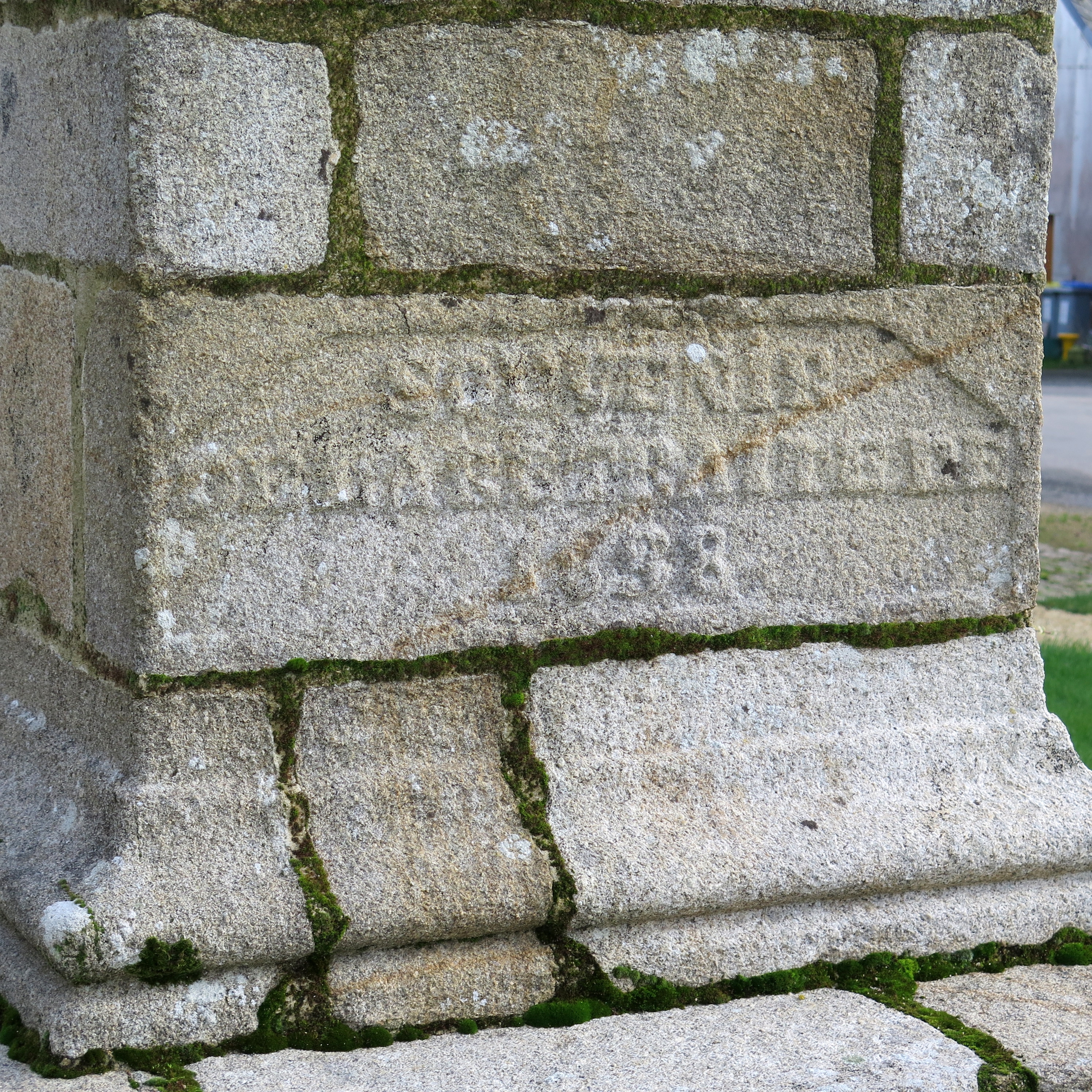 Plufur : croix de l'enclos de l'église, détail du socle. Il porte l'inscription suivante : "souvenir / de la _ / 1838"Immatriculation