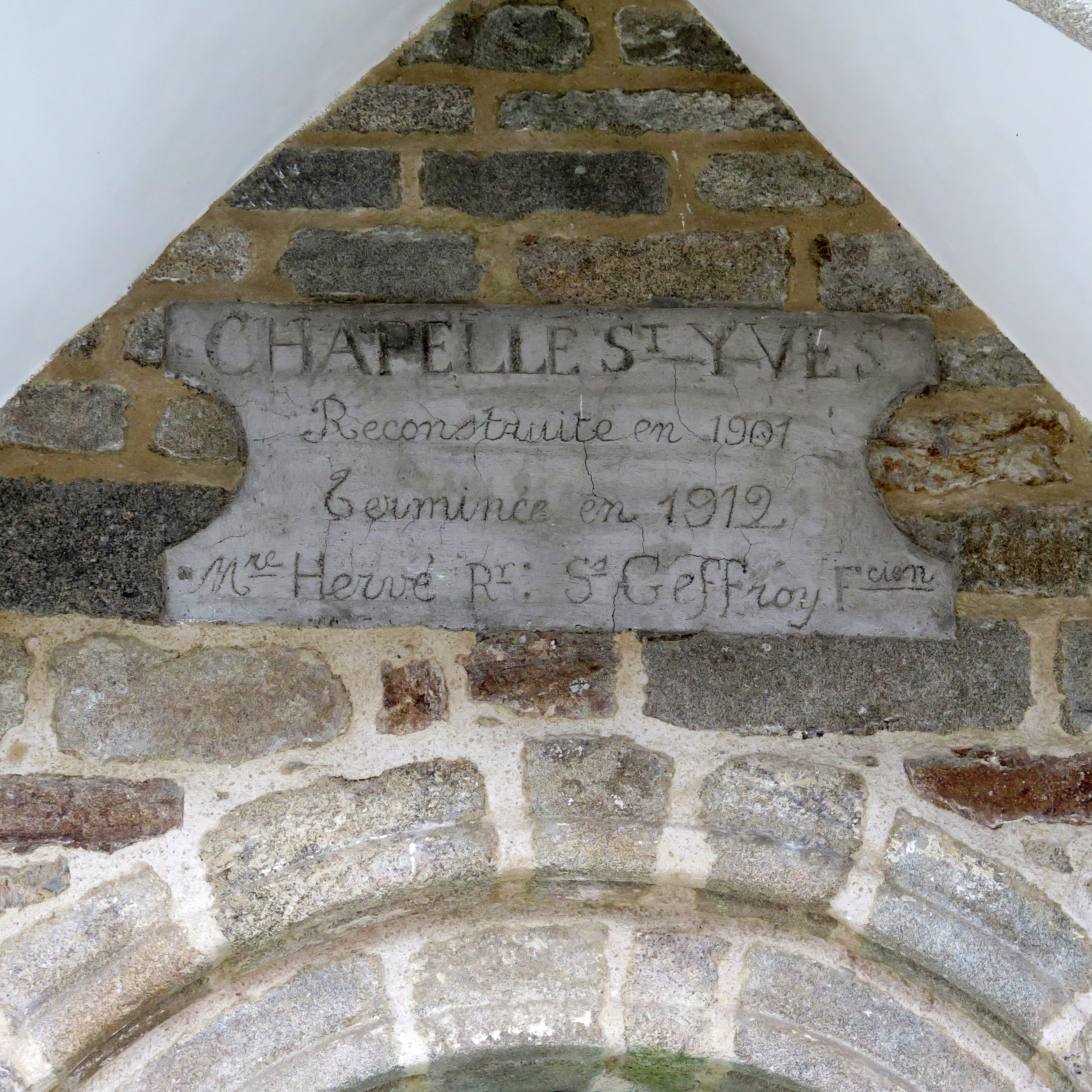 Plufur, le bourg : chapelle Saint-Yves, détail de l'inscription située au-dessus de la porte ouestImmatriculation