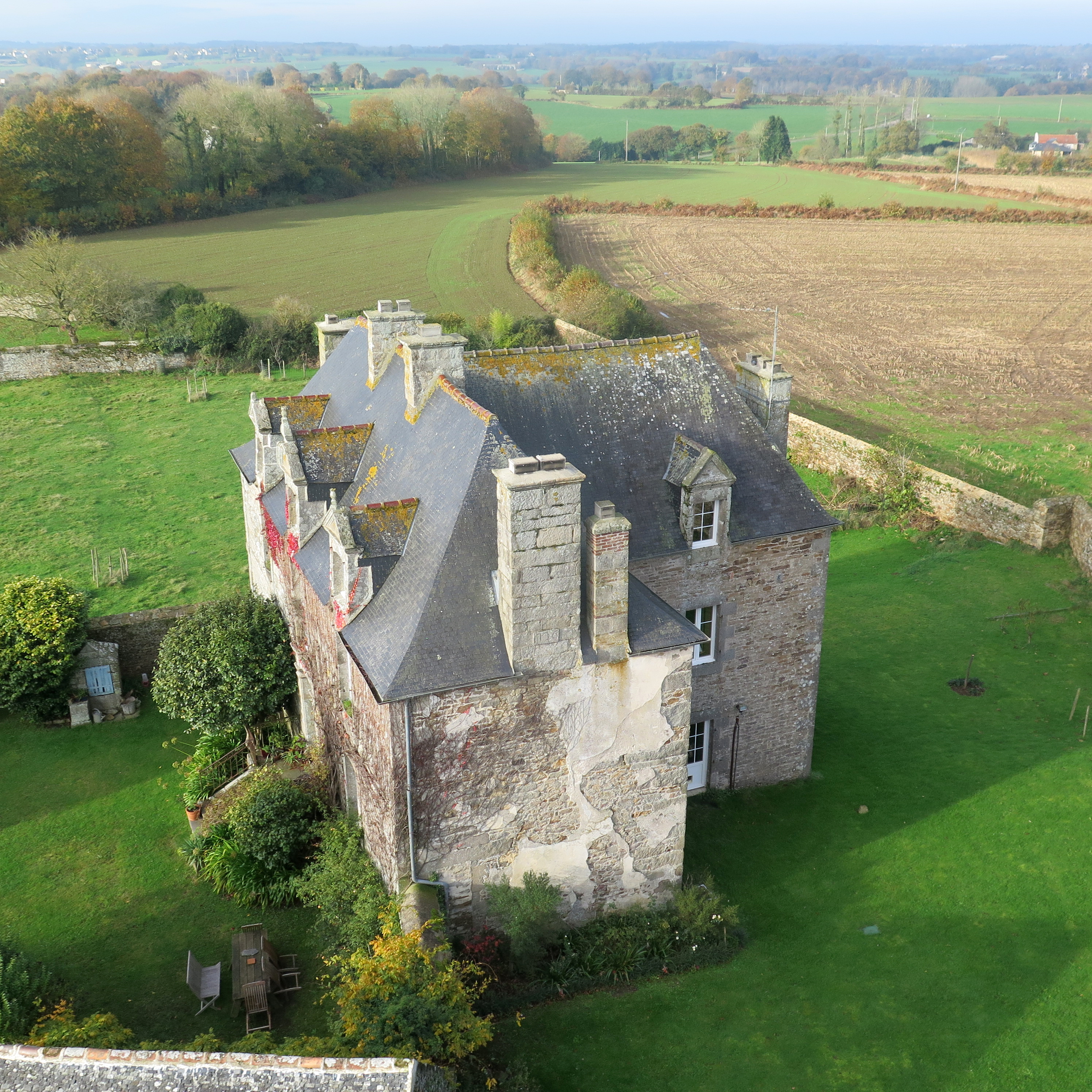 Plufur, le bourg : presbytère, vue générale depuis le clocher de l'église paroissialeImmatriculation