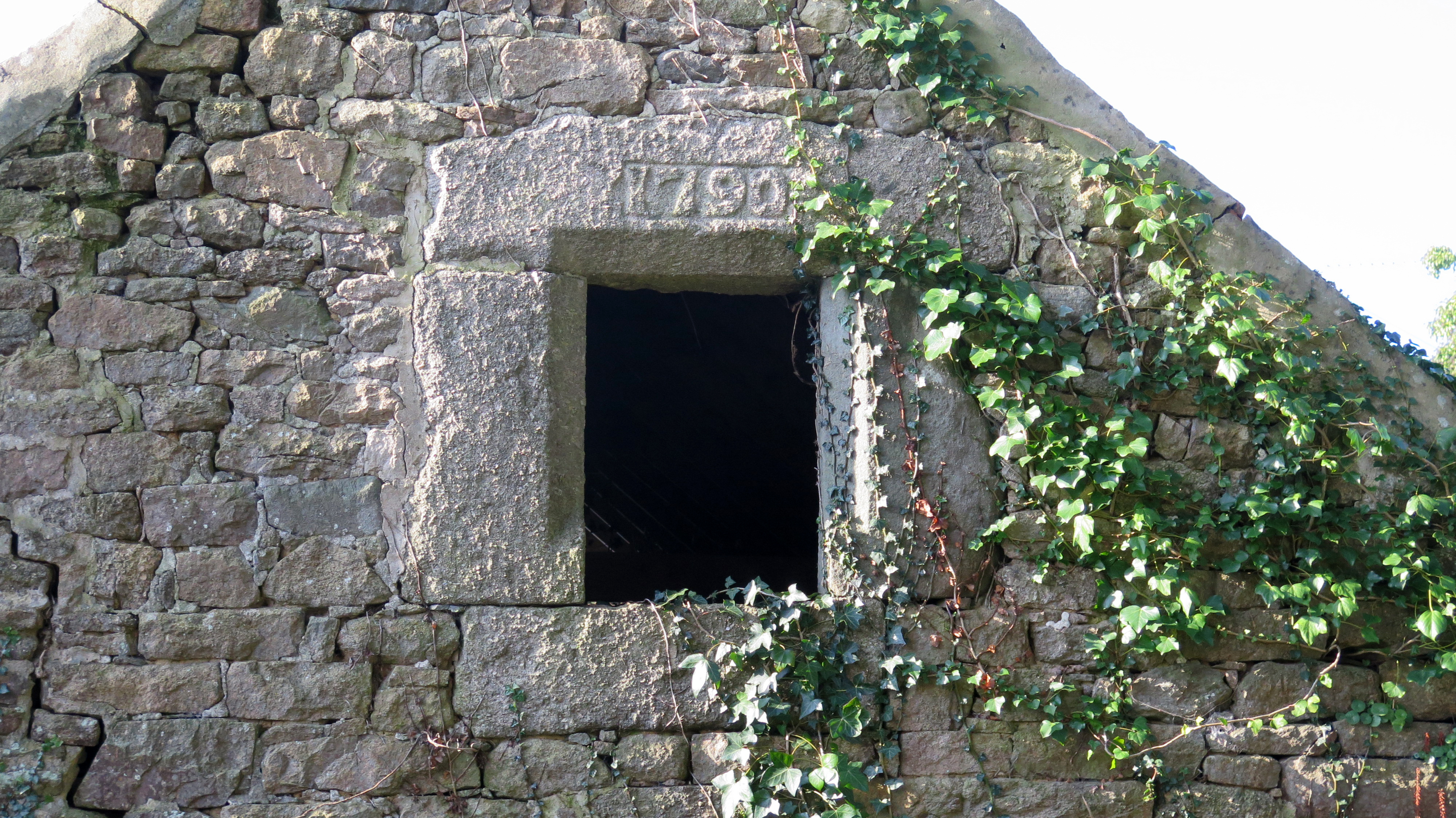 Plufur, Lestéo : dépendance arrière (à usage d'étable), détail de la fenêtre portant le millésime 1790. Les pierres semblent provenir d'un remploiImmatriculation
