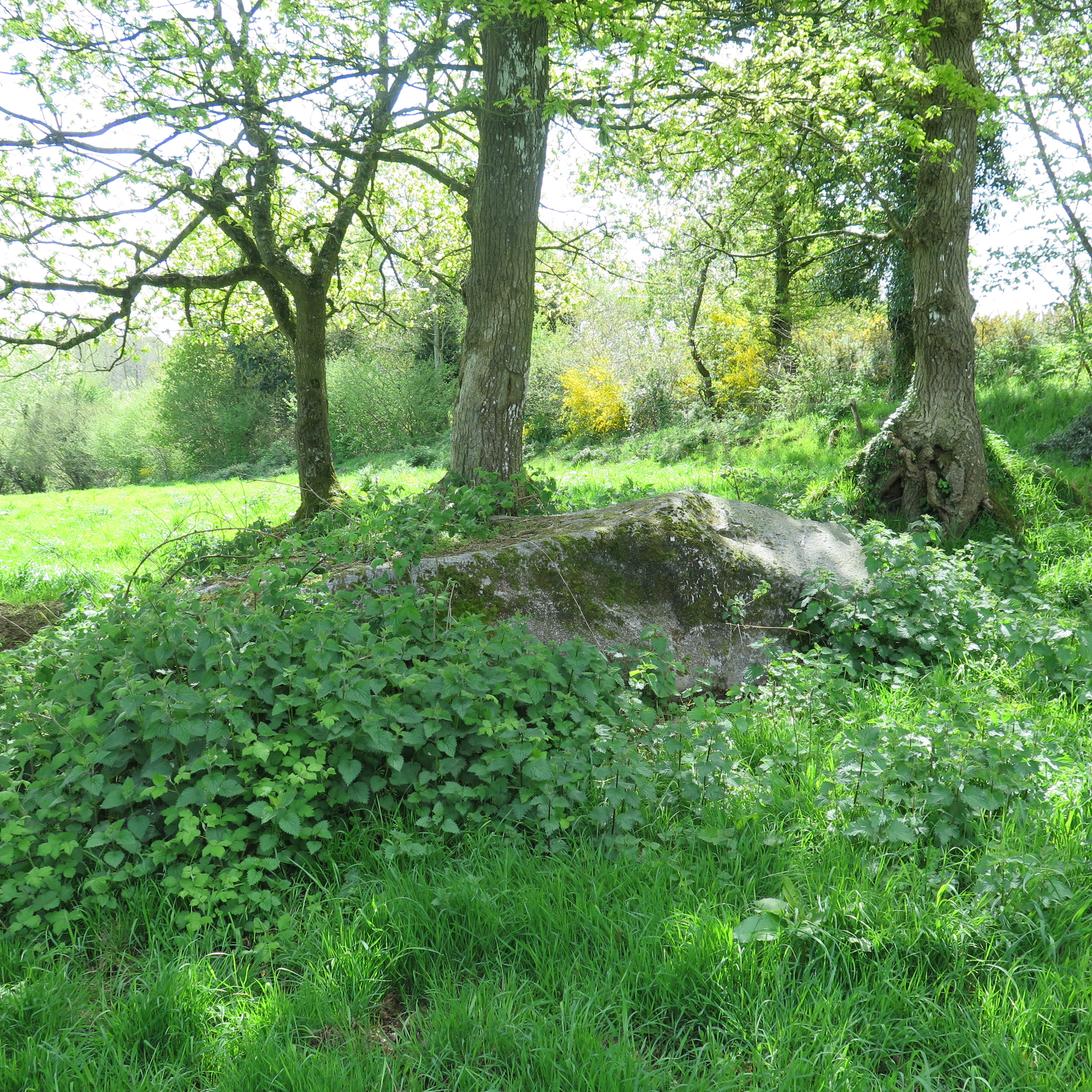 Plufur, environ de l'emplacement du prieuré du Manach'ty : chaos de granite situé au pied d'un bosquet d'arbres. On peut observer des traces de déroctage et des déchets de tailleImmatriculation
