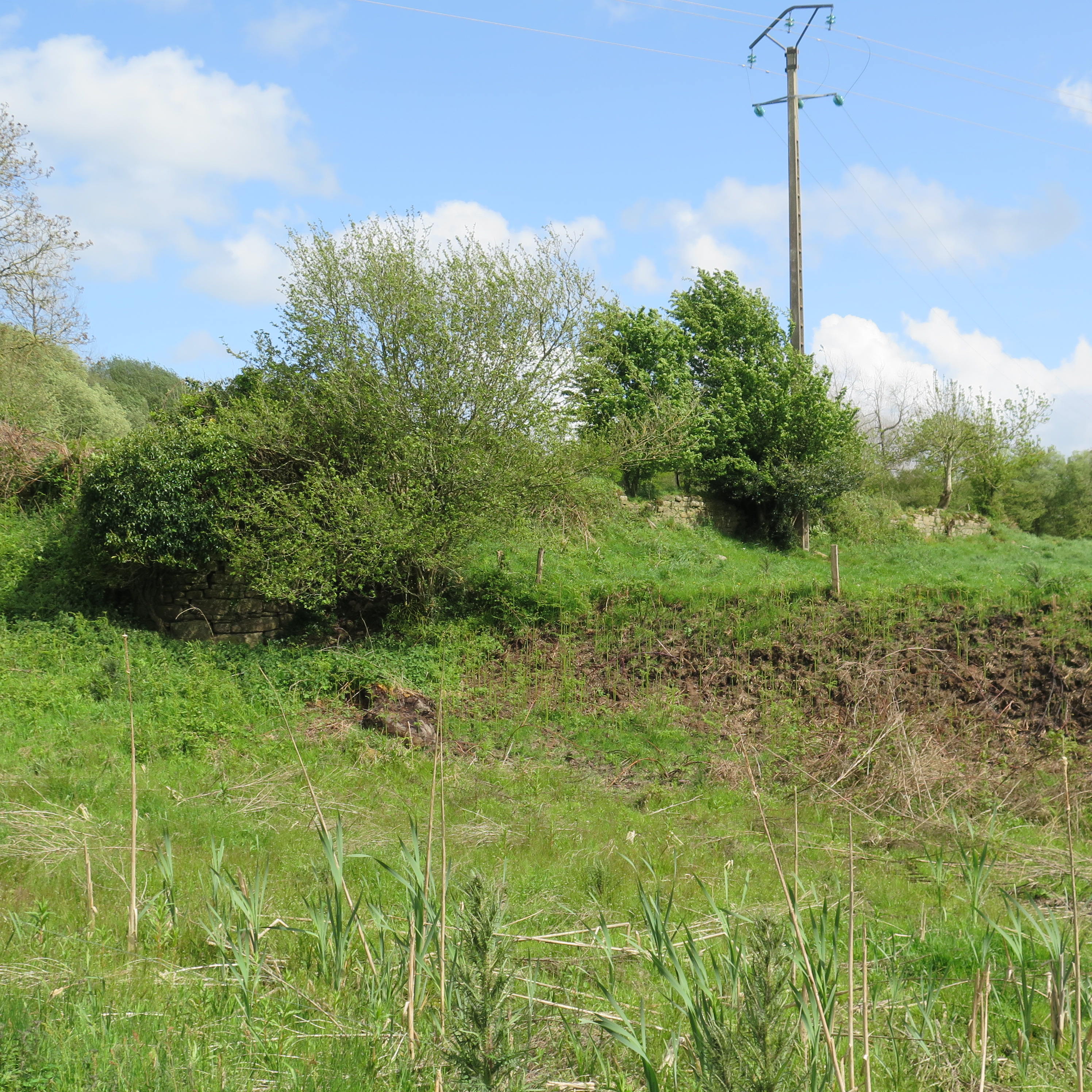 Plufur : emplacement du prieuré du Manach'ty. Au premier plan s'étendait selon le cadastre ancien un étang nommé "Goas Manach". L'enceinte du prieuré (mur et tour circulaire) est recouverte par la végétationImmatriculation