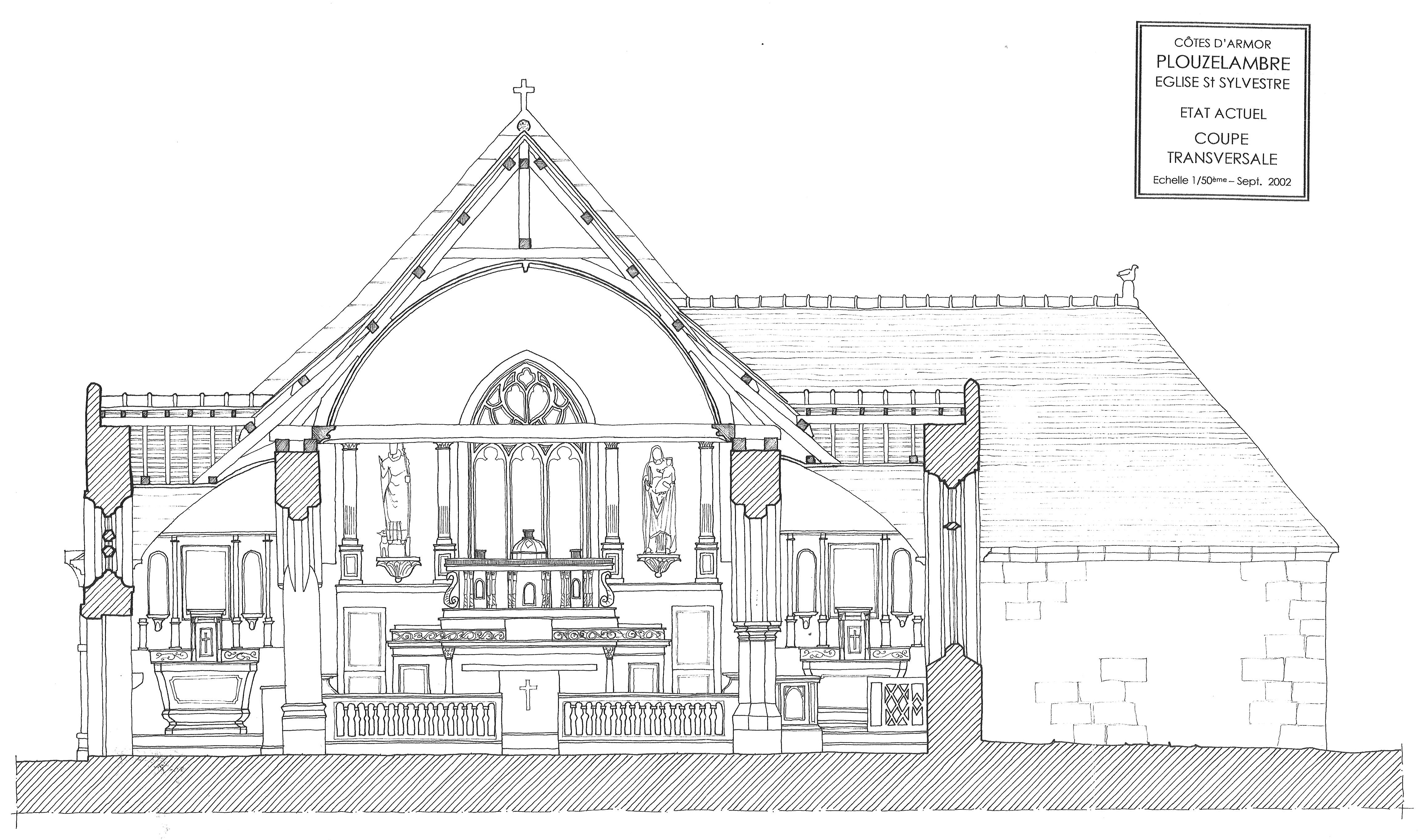Plouzélambre, le bourg, enclos paroissial : coupe transversale de l'église Saint-Sylvestre (extrait de l'étude préalable à la restauration de l'église par Marie-Suzanne DE PONTHAUD, architecte en chef des monuments historiques, septembre 2002)Immatriculation