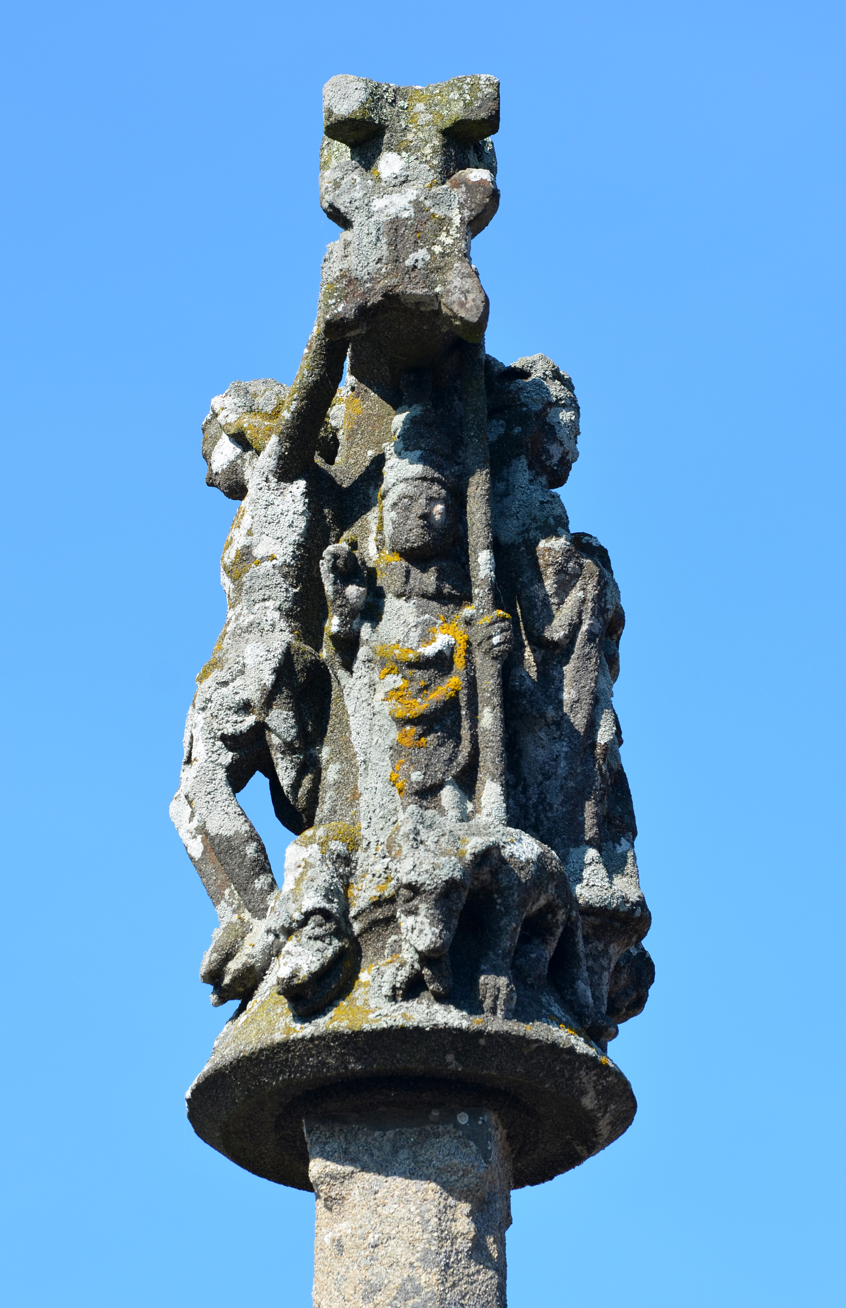 Plouzélambre, le bourg : calvaire, face orientée vers l'est, saint Sylvestre en pape. A ses pieds, un chien (comme saint Gildas son frère qui a la réputation de guérir la rage)Immatriculation