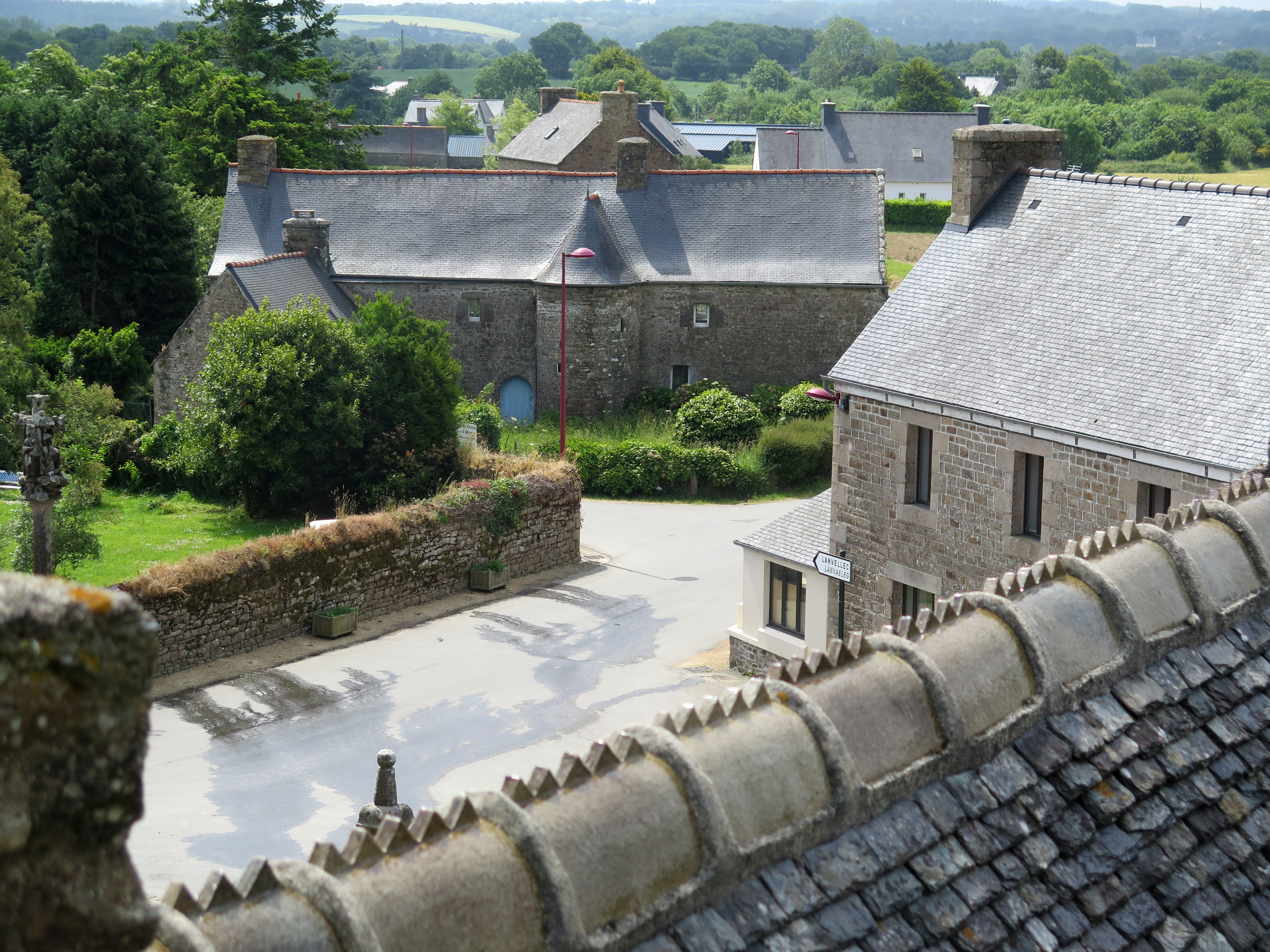 Plouzélambre : le bourg depuis le clocher de l'église paroissiale, vue de situation du manoir de CoquilImmatriculation