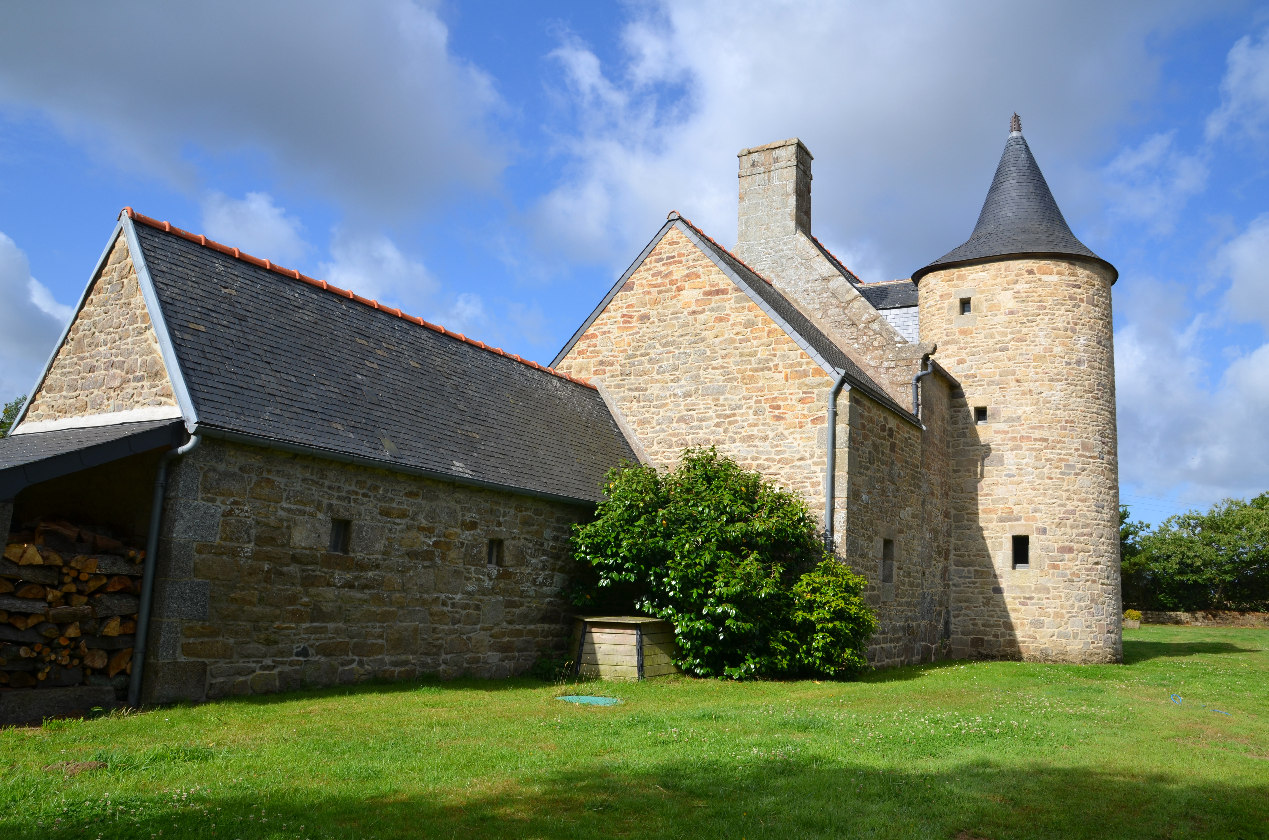 Plouzélambre, Keranboësq : logis et dépendance, vue générale depuis le nord-est. La tour d'escalier a été créée ex-nihilo dans les années 1980 en s'inspirant de celle du manoir de Kerbest à PlouaretImmatriculation