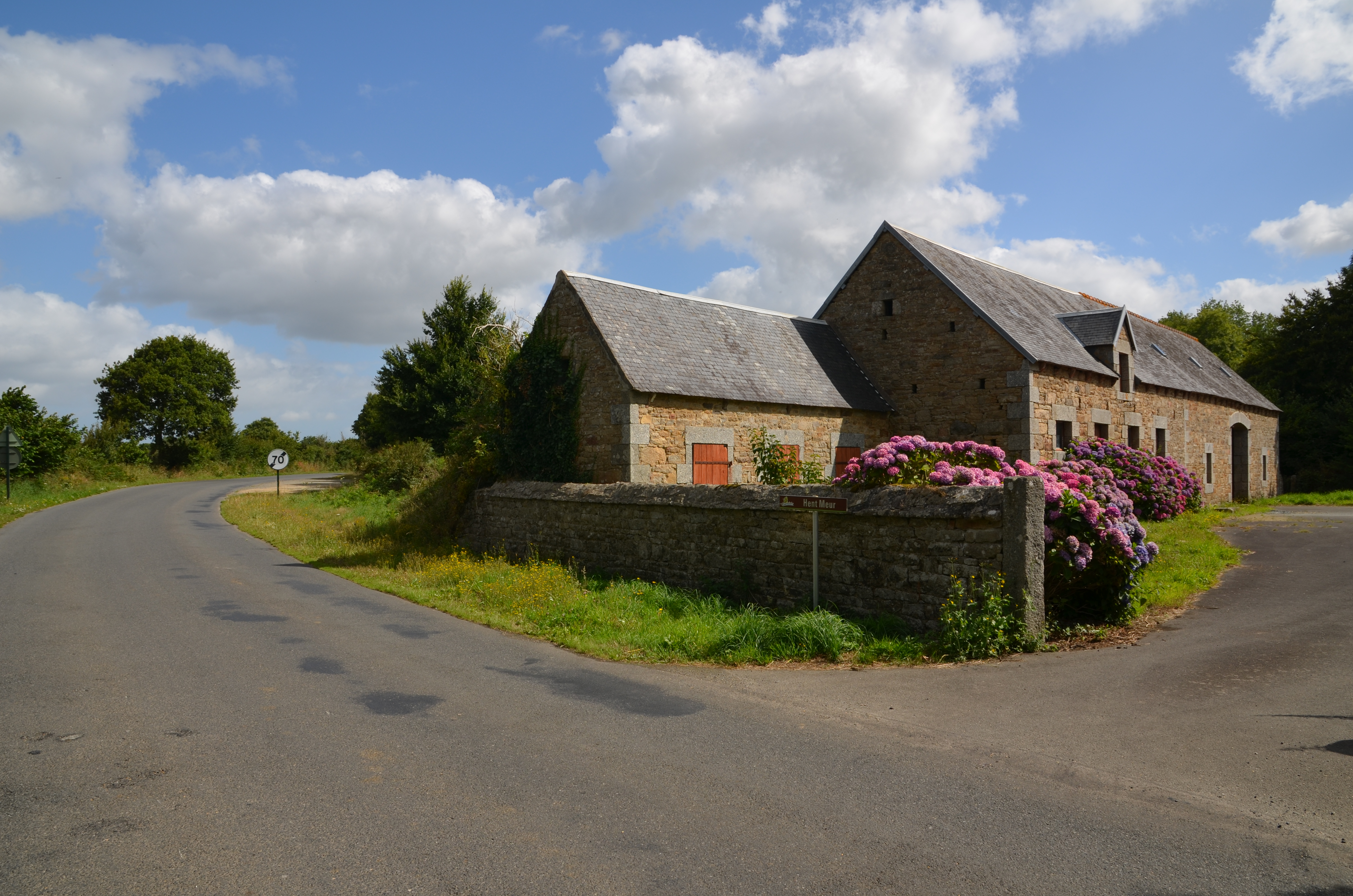 Plouzélambre, Hent Meur : dépendances de la ferme (soues à cochon, étable, grange-remise), vue générale depuis l'entrée de la cour. Cet ensemble à vocation agricole est datable de la seconde moitié du 19e siècleImmatriculation