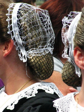 La coiffe du pays Fanch portée par le cercle celtique de Saint-Nicolas du Pelem.Immatriculation