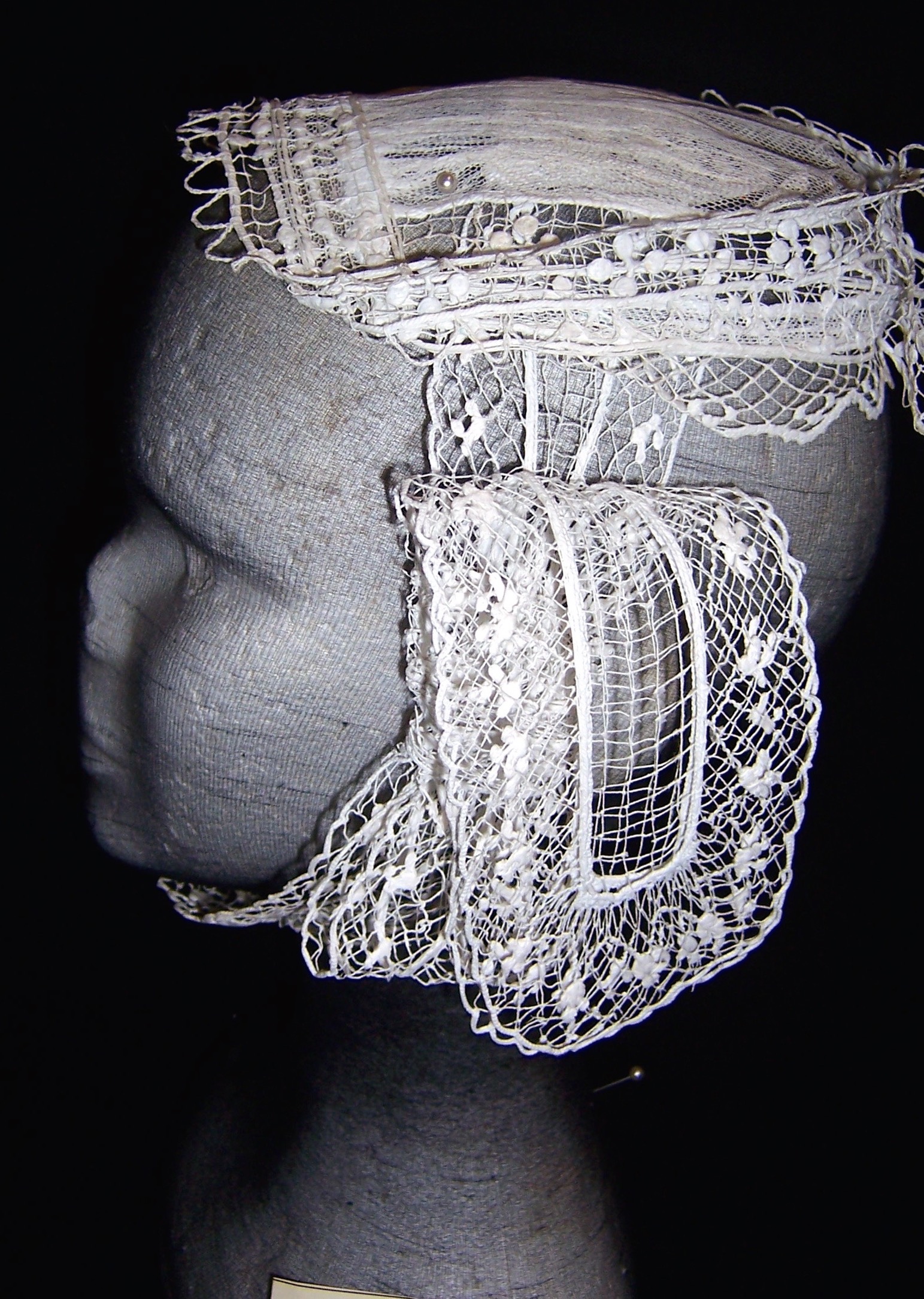 Cette coiffe se distingue par un fond en tulle hexagonal bordé d’un bavolet en filet. La mentonnière comporte deux techniques différentes de filet. En central, le filet carré traditionnel et, en bordure du filet, en mailles losange.Immatriculation
