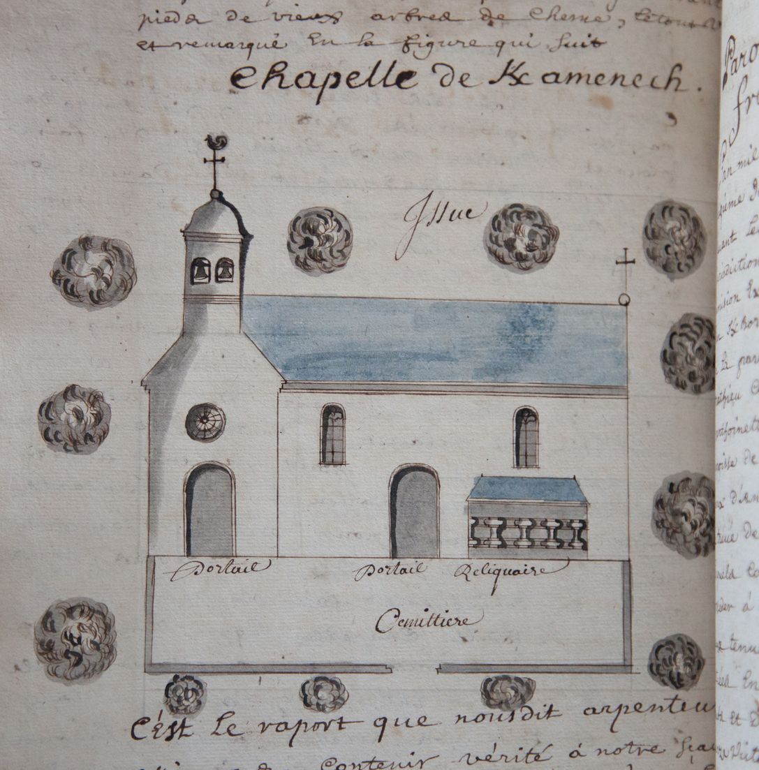 Chapelle Saint-Jean de Keramanac'h (Plounévez-Moëdec), Dessin à la plume aquarellé, 1731 (A. D. de La Vienne, 3H1 450)Immatriculation