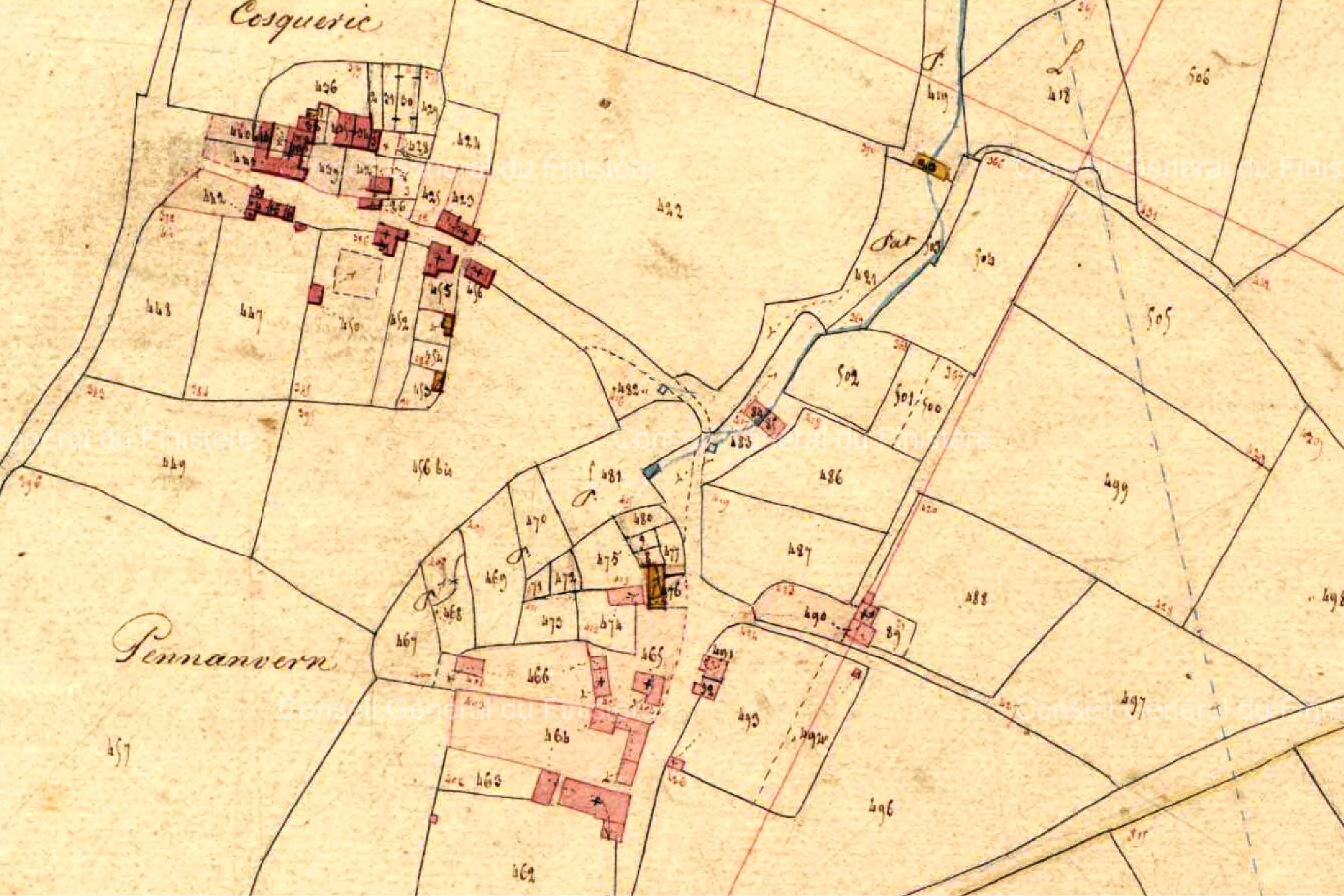 Extrait du plan du cadastre napoléonien de la commune de Saint-Thégonnec (parcelles n°E84 et 85)Immatriculation