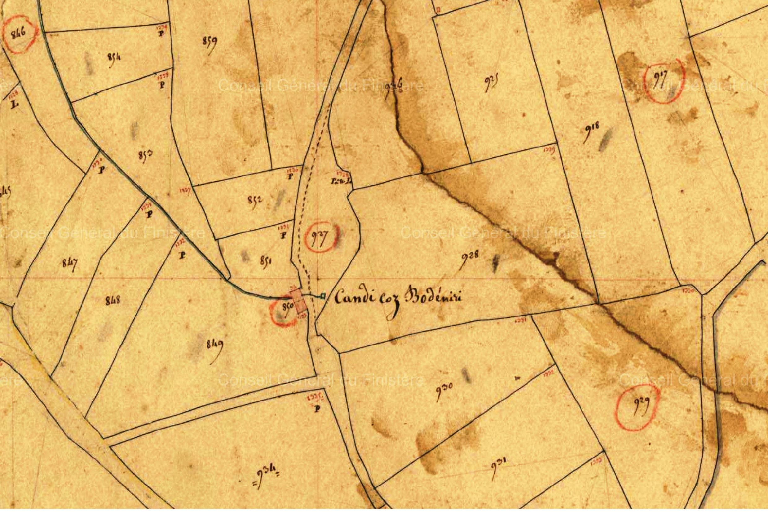 Extrait du plan du cadastre napoléonien de la commune de Saint-Thégonnec (parcelle n°i850)Immatriculation