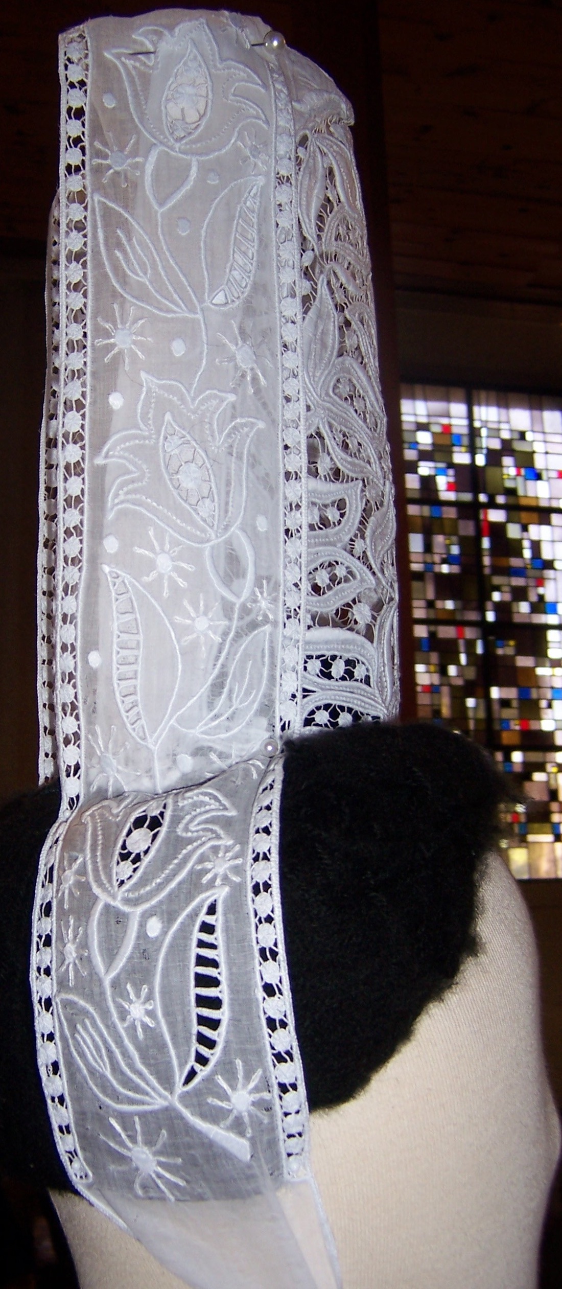 Coiffe en organdi brodé de la collection de Paul Balbous et présentée lors de l' exposition organisée par Bleuniadur dans la chapelle du Kreisker à Saint-Pol de Léon en Juillet 2013. (Photo Ijin ha Spered ar Vro)Immatriculation