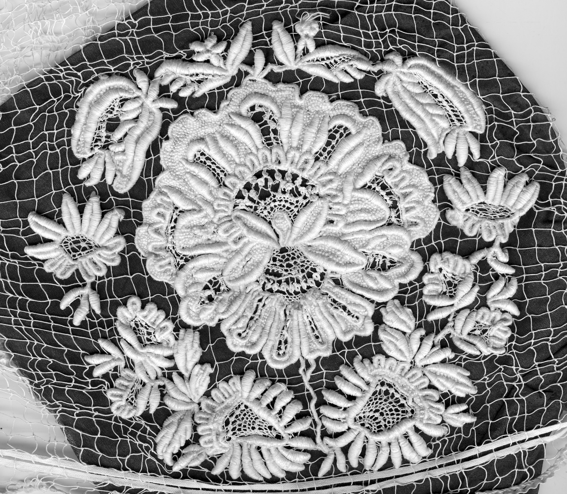 Collectage de l'association Ijin ha Spered ar Vro. Fond de Sparlenn brodé sur filet irrégulier, base de la majorité des coiffes de ce territoire. Broderie plumetis trés élaborée nécessitant pour la réalisation une superposition de tulle sur le filet. Coiffe prêté par Jeannine Quéré de Plouvorn.Immatriculation