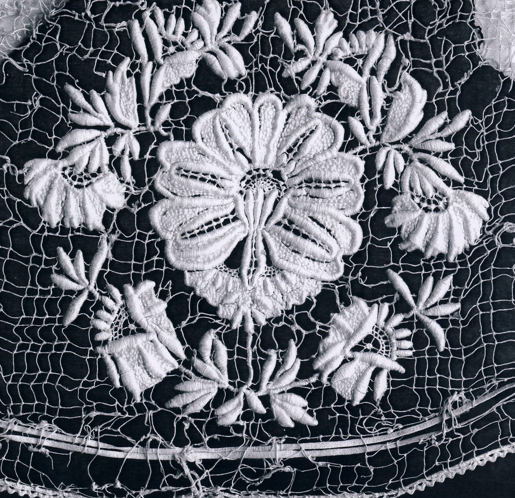 Collectage de l'association Ijin ha Spered ar Vro. Fond de Sparlenn brodé sur filet irrégulier, base de la majorité des coiffes de ce territoire. Broderie plumetis appliquant la même métode que la précédente illustration.Immatriculation