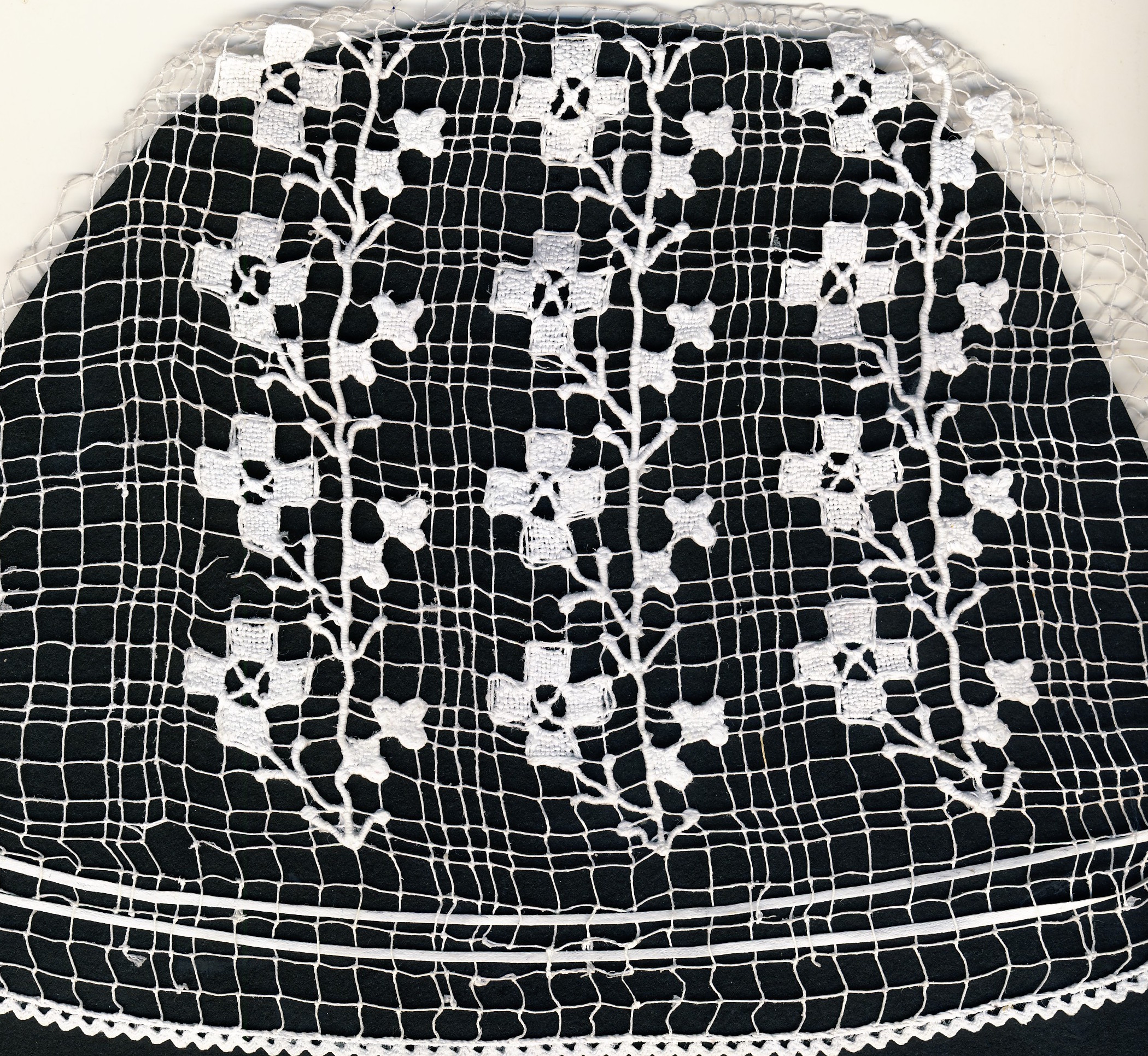 Collectage de l'association Ijin ha Spered ar Vro. Fond de Sparlenn brodé sur filet irrégulier, base de la majorité des coiffes de ce territoire. Broderie en filet d'art.Immatriculation