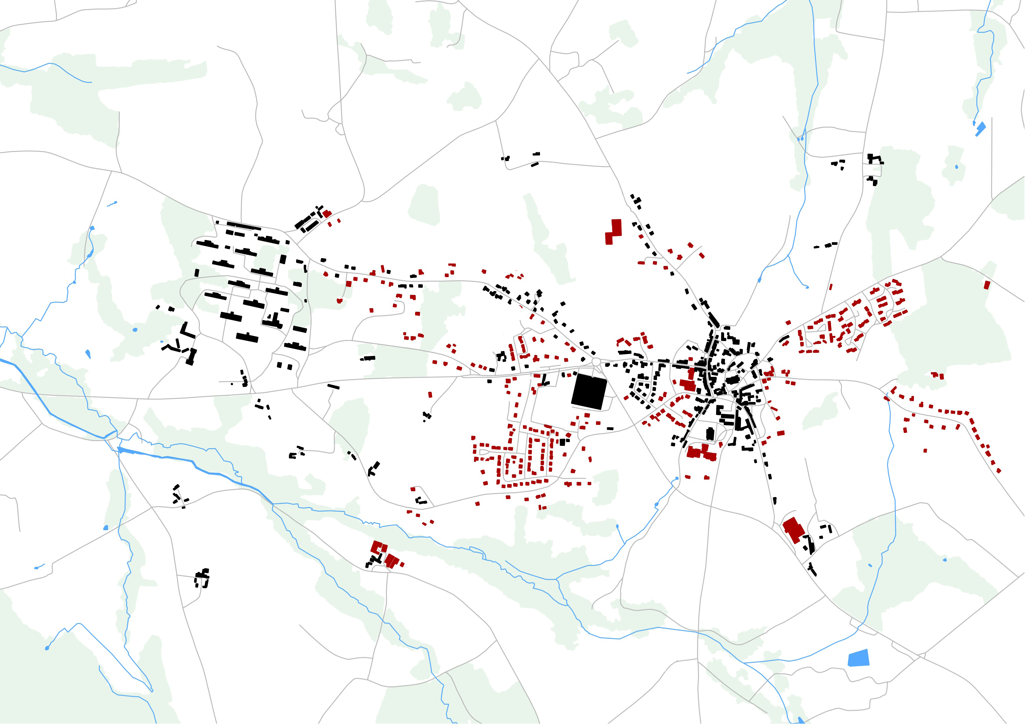 Carte générale d'évolution de l'implantation du bâti du bourg de Plougonven - bâti apparu entre 1970 et 1990 (en rouge)Immatriculation