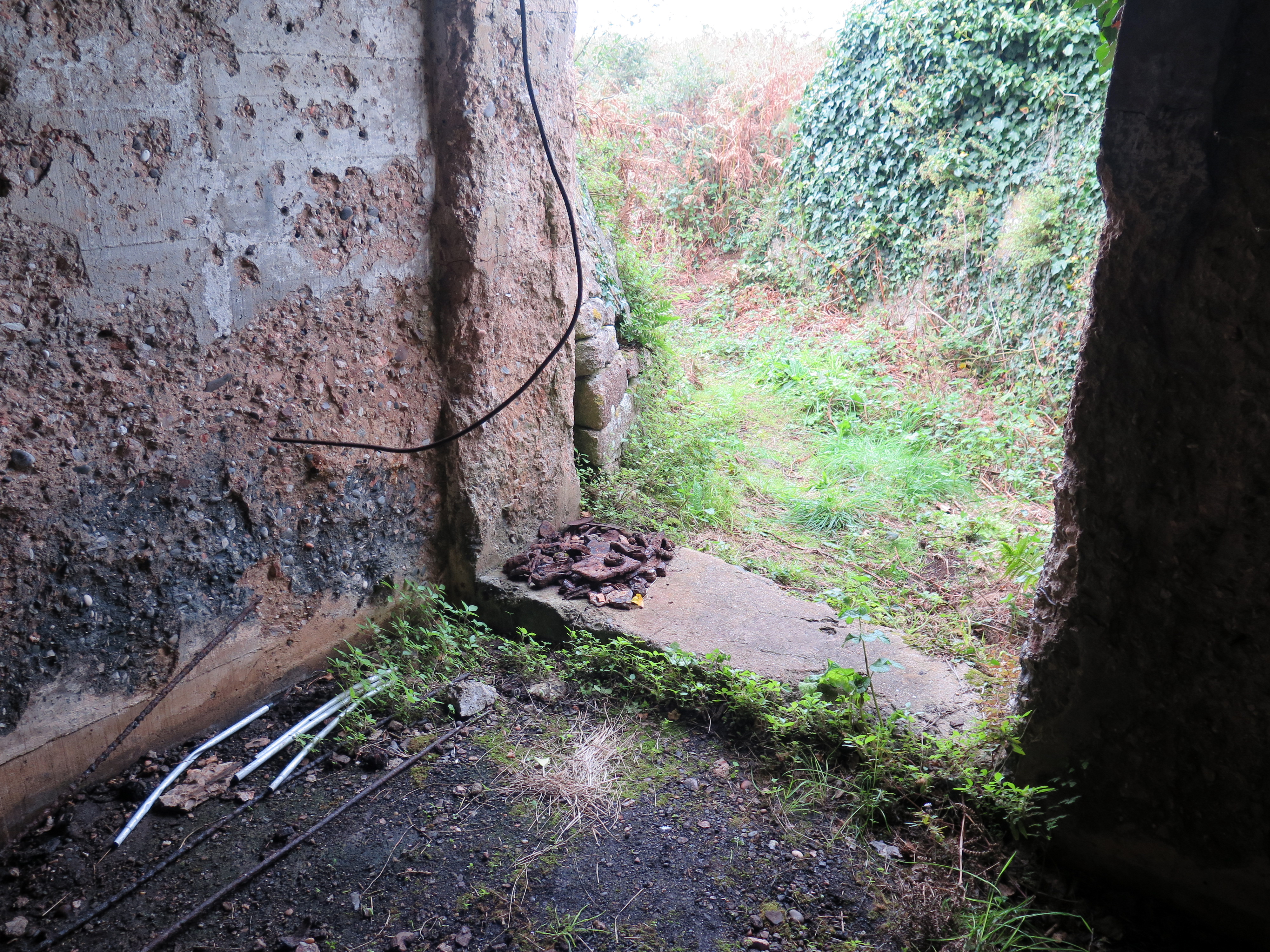 Landéda, fort Cézon : casemate pour arme mixte (canon antichars de 4,7 cm et mitrailleuse de calibre 7.92 mm), canon Skoda en place. Il a été saboté par pétardage : état de l'entrée criblée d'éclatsImmatriculation
