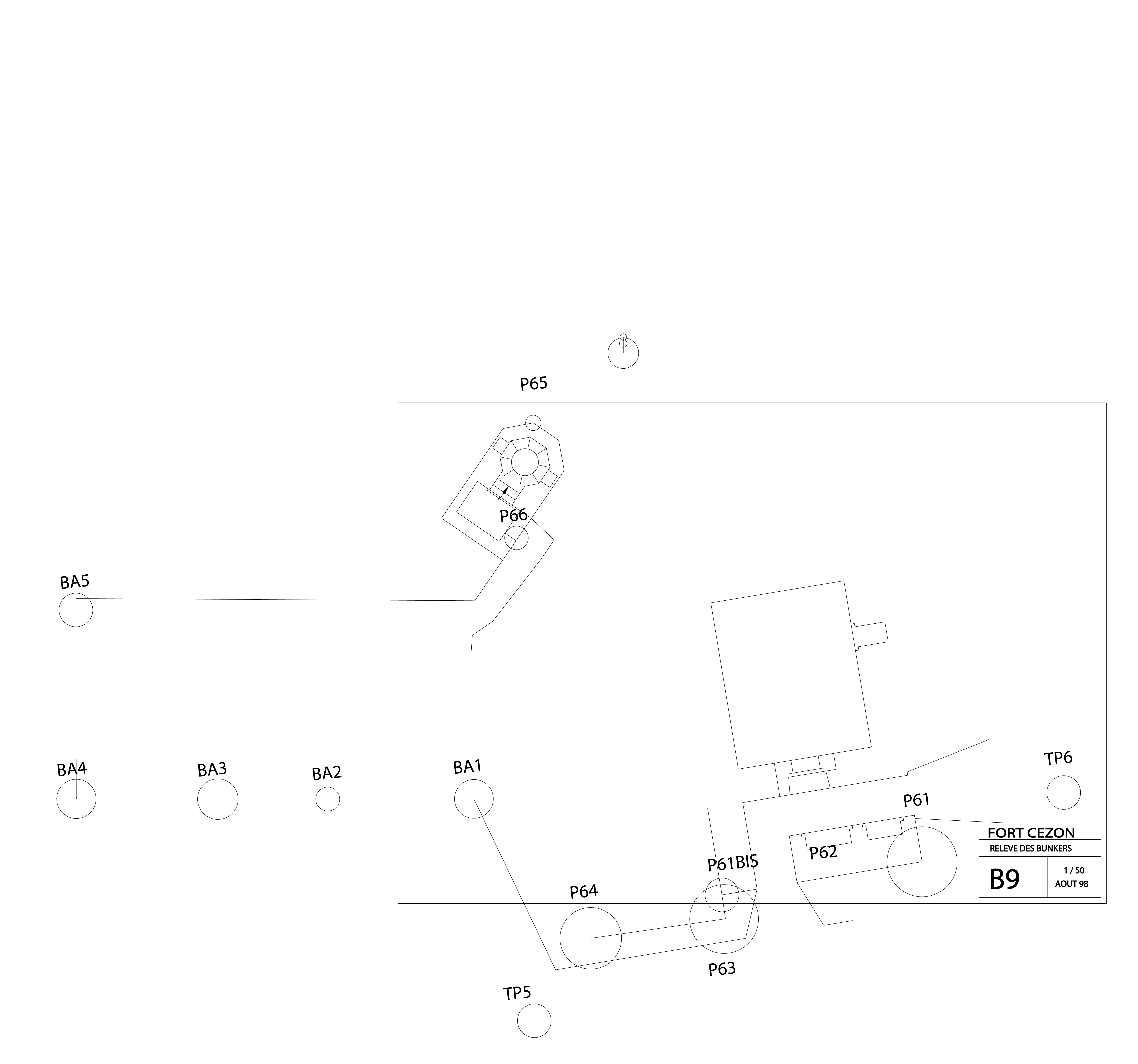 Landéda, île Cézon : plan de l'un des 6 postes d'observation dit Tobrouk, de l'un des abris bétonnés de type VF et du bassin (?) du fort Cézon (relevé : Association Cézon, août 1998)Immatriculation