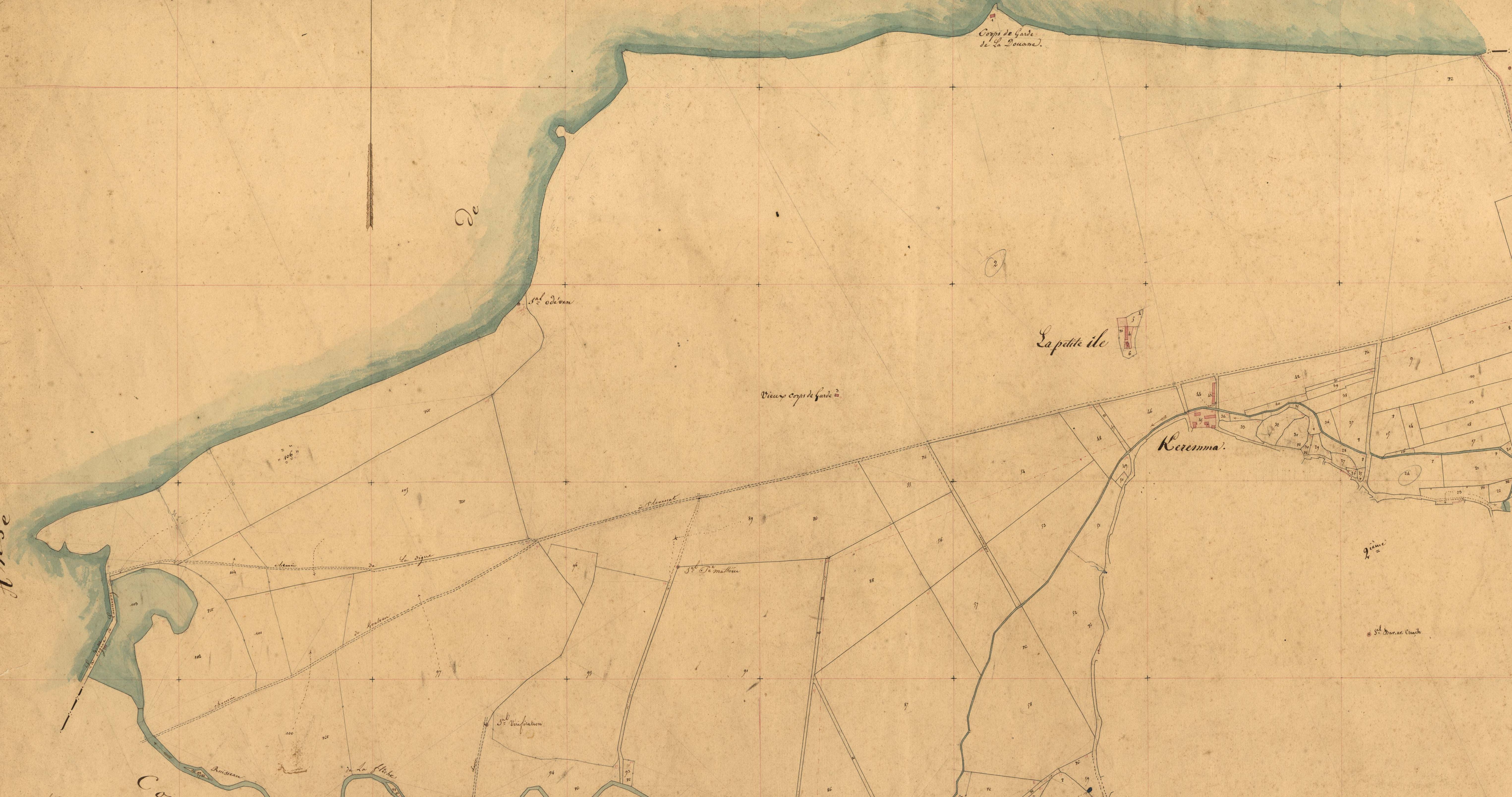 La dune qui précéda Ker Emma sur le cadastre de 1836 (A. D. du Finistère, 3 P 287/2) ; seul apparaissent le corps de garde de la douane, au bord de la mer, la Petite Île et Ker Emma et le vieux corps de garde, à l'ouest de ces deux derniers ; à l'ouest, la digue de Lannénez fait barrage au ruisseau de la Flèche et se poursuite par le chemin menant à Plouescat, tracé en pointillésImmatriculation