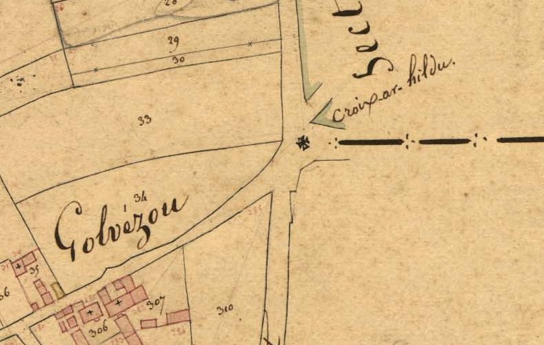 La "croix ar Hildu" à l'emplacement actuellement de la croix de la Gare sur le cadastre de 1836 (A. D. du Finistère, 3 P 287/8)Immatriculation