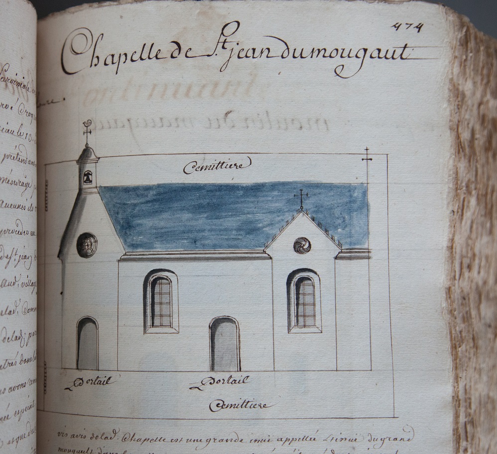 Chapelle Saint-Jean de Mougaut. Dessin à la plume aquarellé, 1731 (A. D. de La Vienne, 3H1 449)Immatriculation