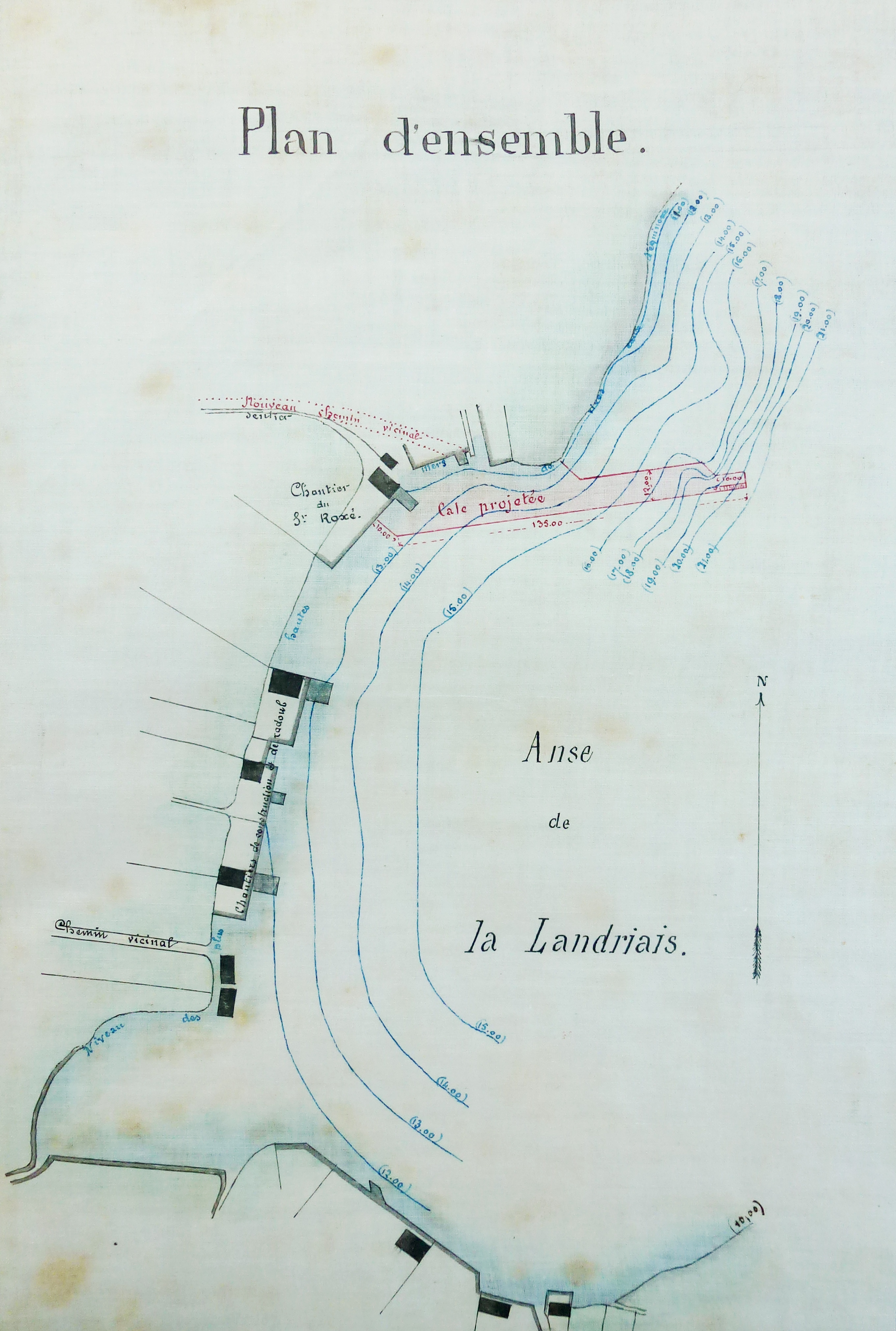 La carte figure l'emplacement et le plan de cale projetée dans l'anse de la Landriais en 1872.