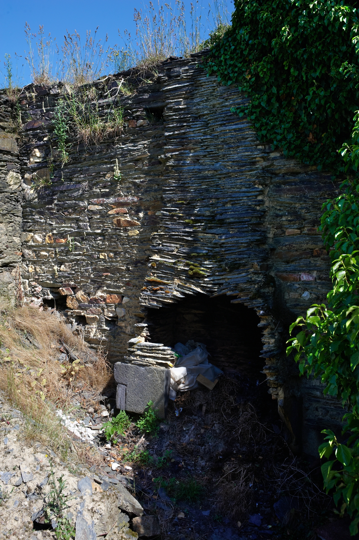 Bâtiment en ruine : vestige de la cheminée du rez-de-chaussée ; on distingue encore une console et une partie du linteau en schiste (état en 2015)Immatriculation