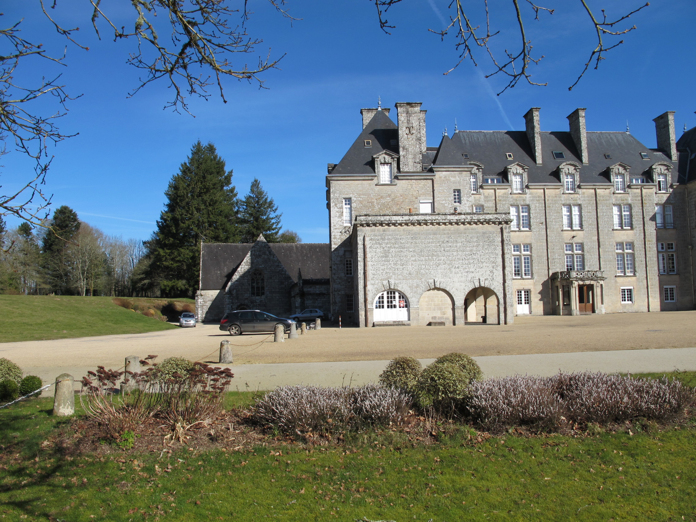Vue sud du logis et de la chapelle sainte Anne provenant de Pluméliau, état en 2015Immatriculation