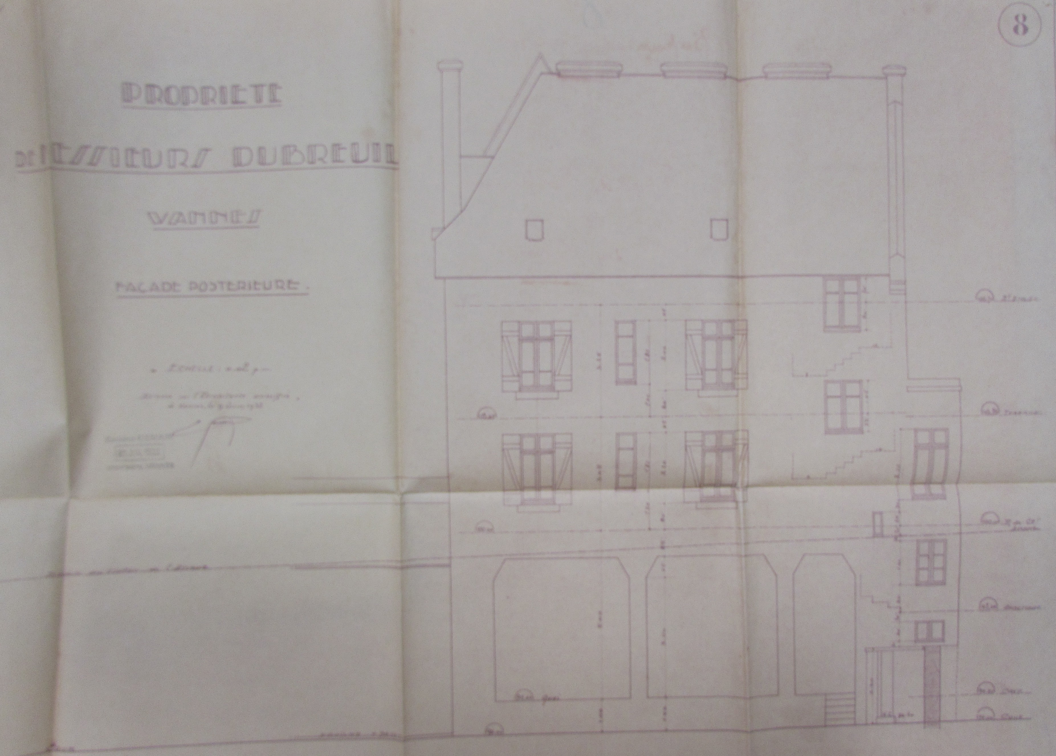 Elévation postérieure par Gemain, 1932. AM Vannes fonds Groleau.Immatriculation