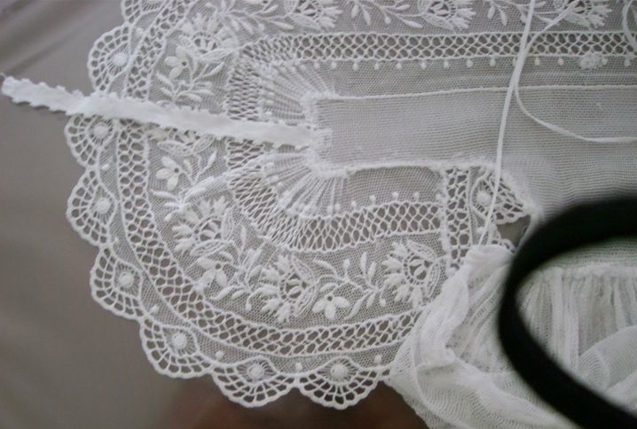 Détail d’une coiffe comportant un lacet de part et d’autre de la partie centrale en tissu et un lacet pour resserrer le bonnet. Les autres coiffes examinées ne comportent pas ces éléments. (collection particulière Le Corre Ploemeur (56))Immatriculation