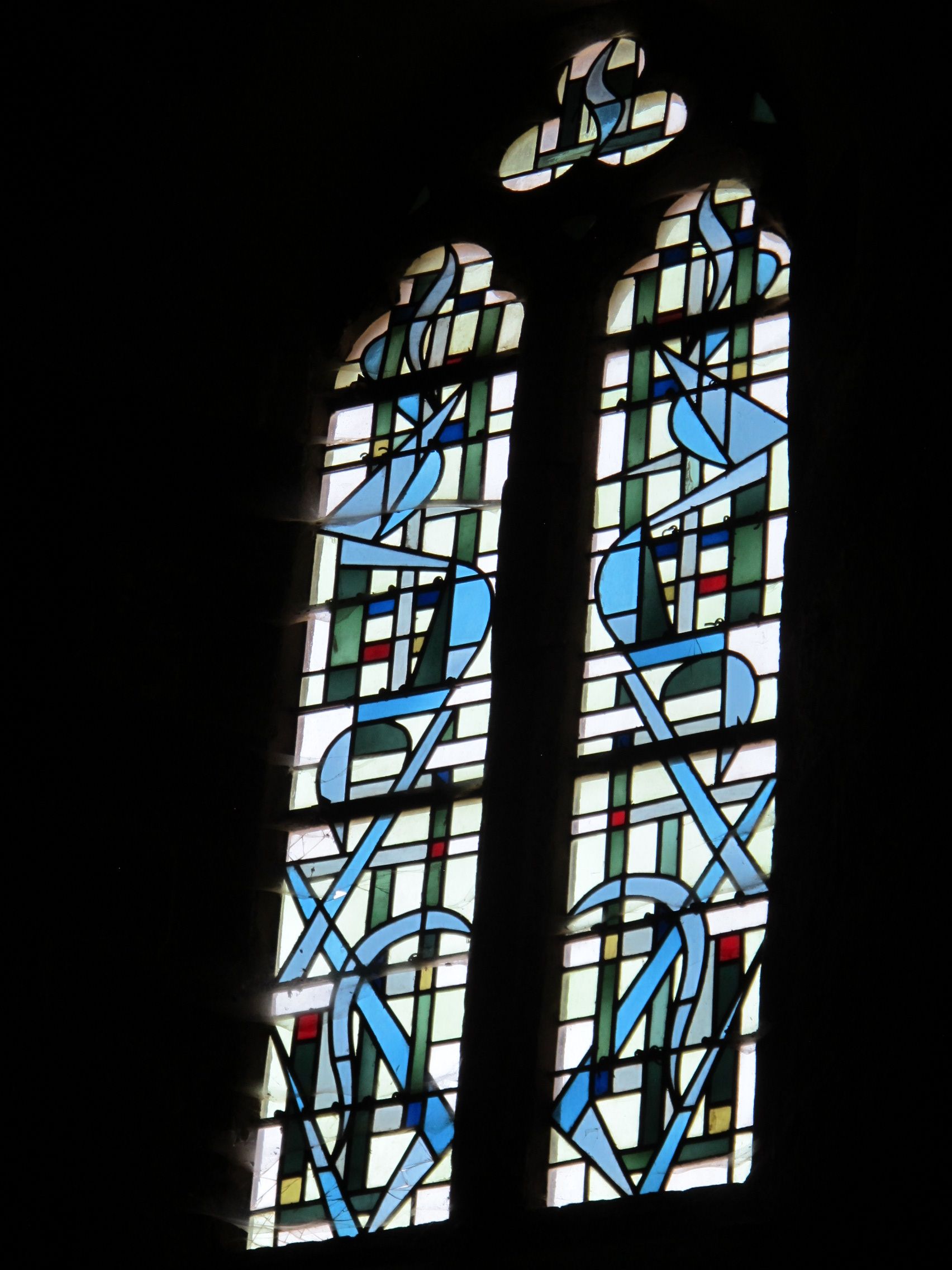 Ensemble de quatre verrières de la baie 2 : Les mystères du Rosaire et des baies 6, 8 10, non figuratives, église Saint-Gilles (Malestroit),