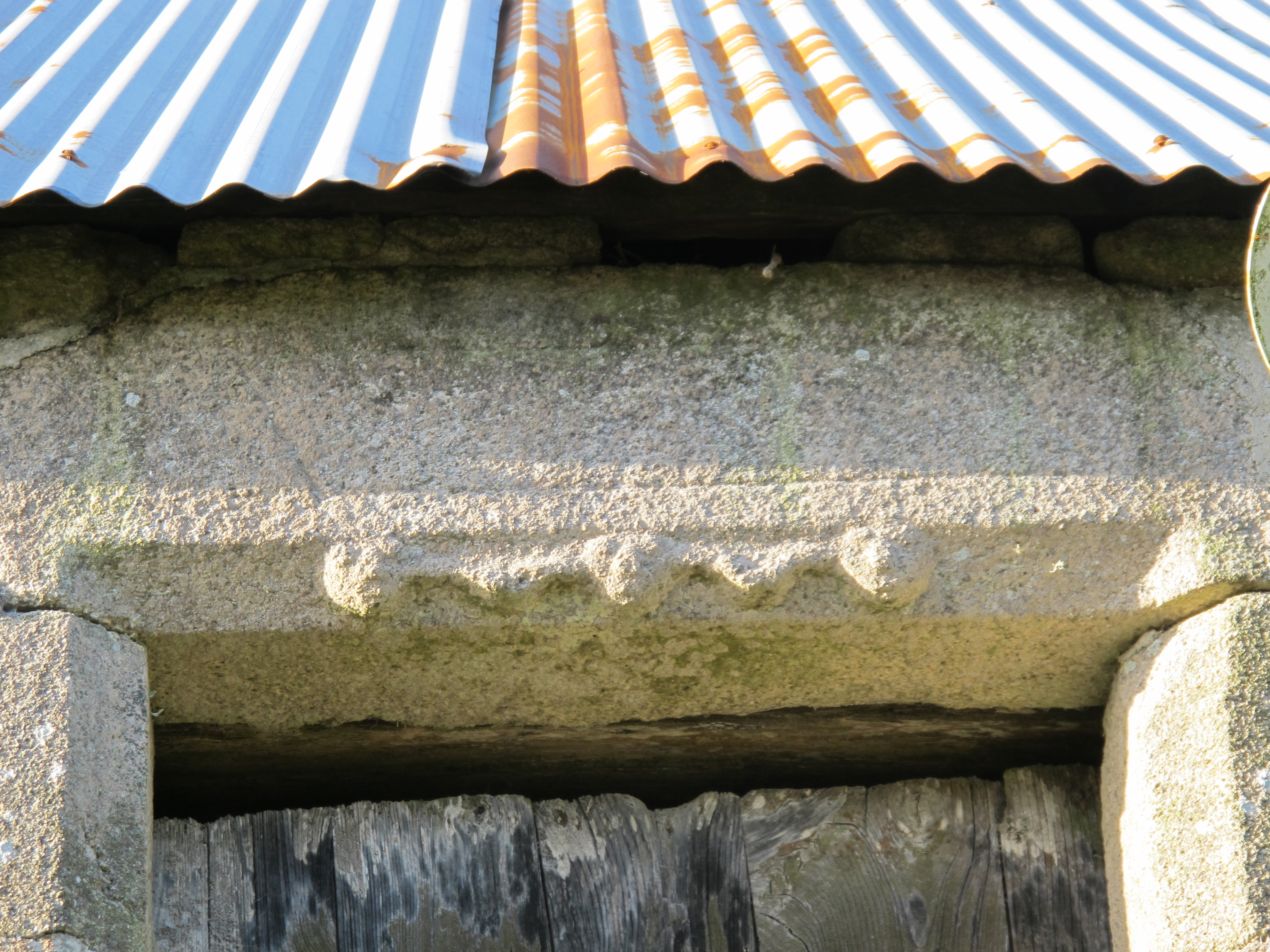 Rozulaire Braz, ferme dit 44, partie nord (logis à étage), linteau de la fenêtre de l'étage à décor sculpté de têtes, état en 2015Immatriculation