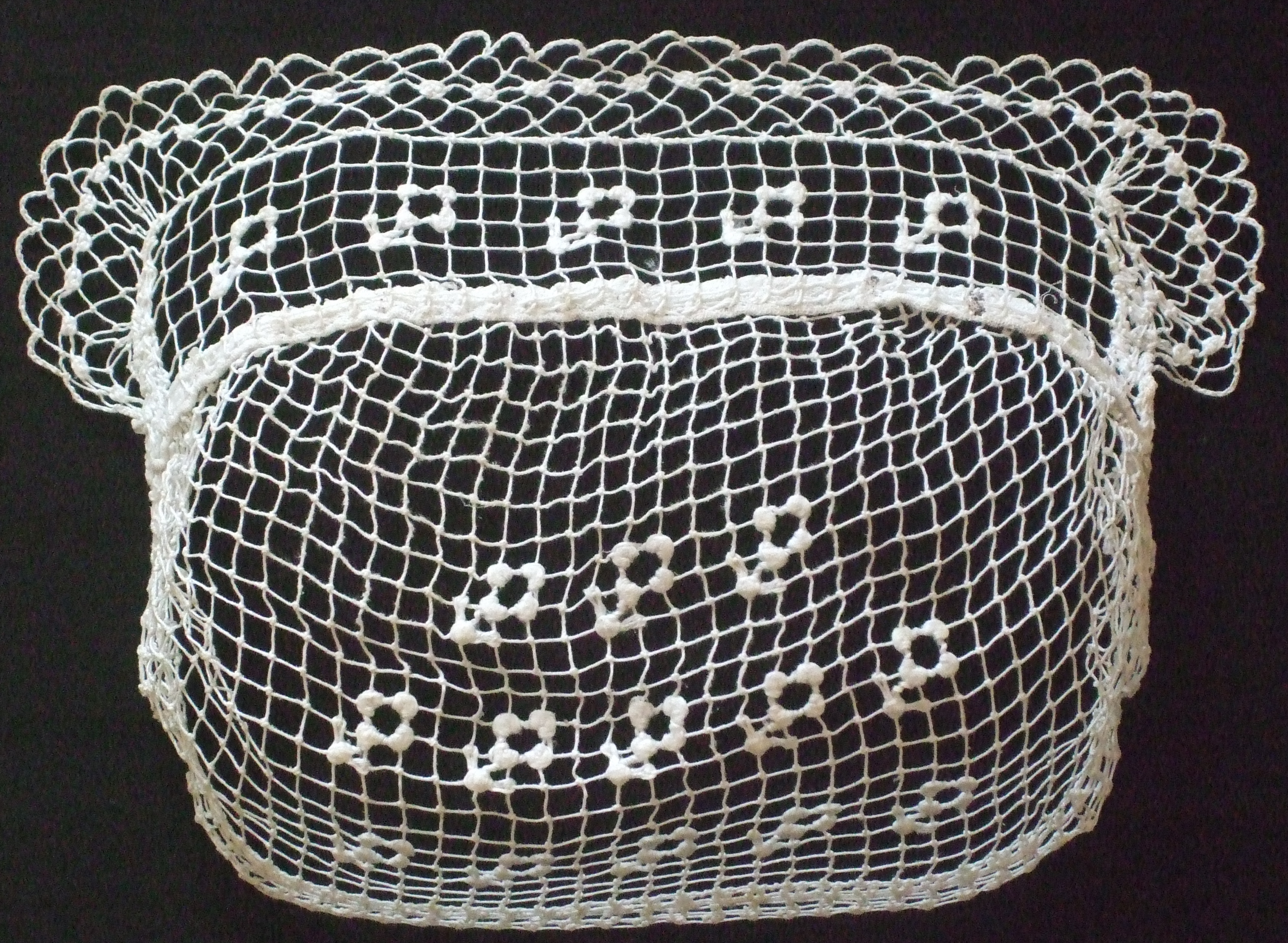 Coiffe en filet carré avec petites fleurs brodées et associant filet en mailles carrées et en mailles losanges. Collection et photo de Michel Rocher.Immatriculation