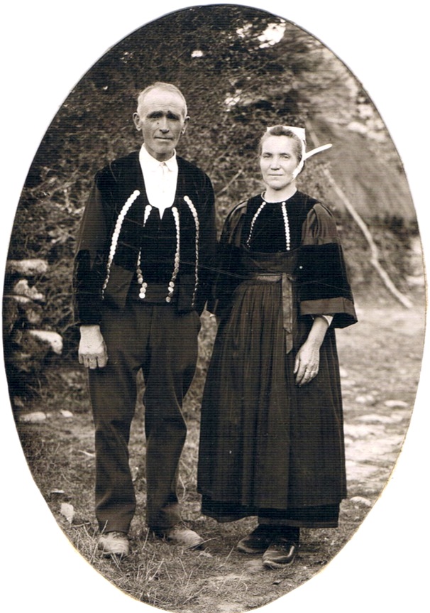 IwanToquin (tailleur) et Maï-Zuian Talhouët, de Persquen au début du XXe siècle devant leur maison – une chaumière – à Toulhouët (photographie de famille Yvonne Olivier).Immatriculation