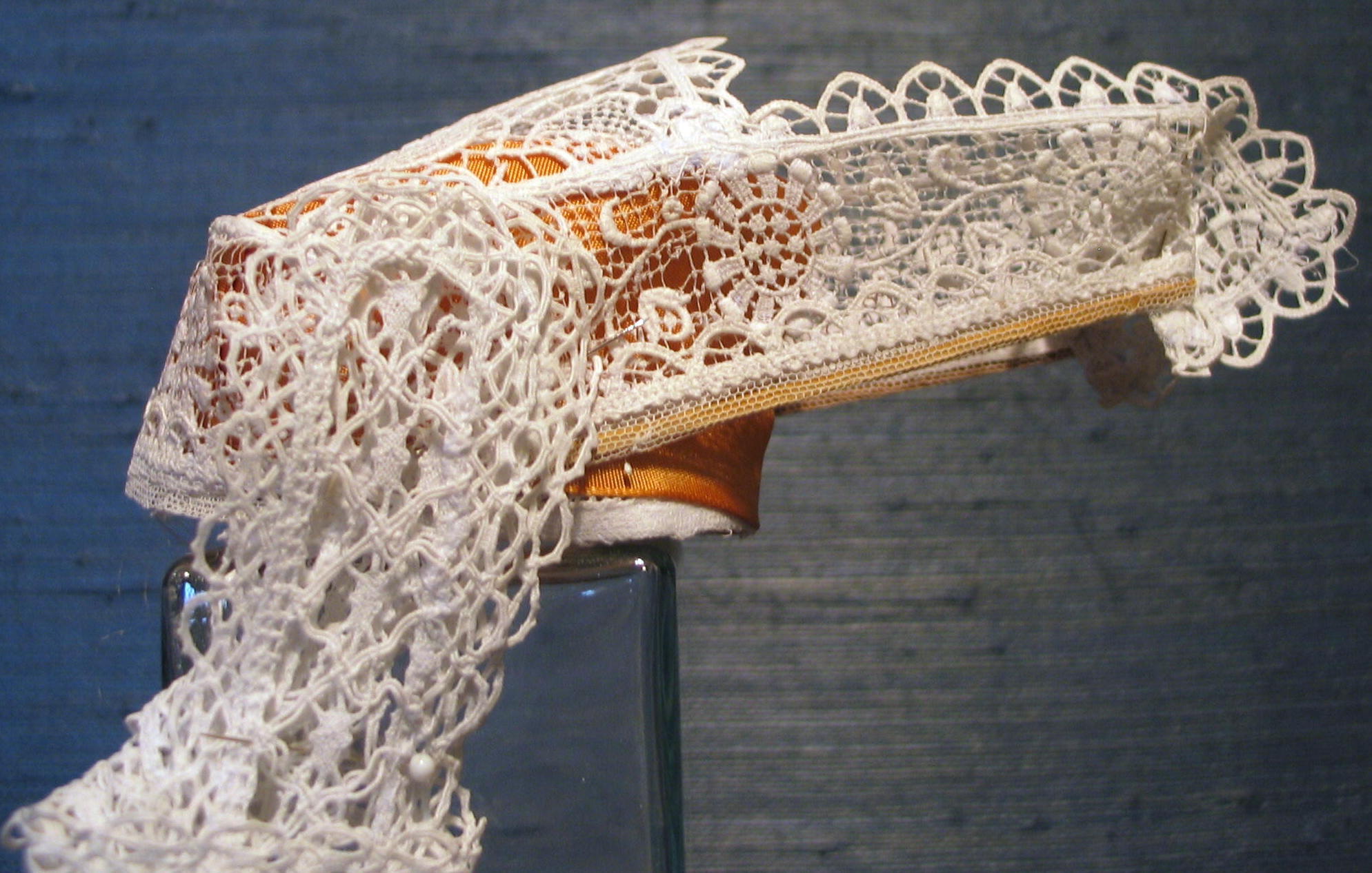 Coiffe Pourleth en dentelle mécanique avec la sous-coiffe et le tissu de couleur. (Collection personnelle de Vincent Roussel)Immatriculation