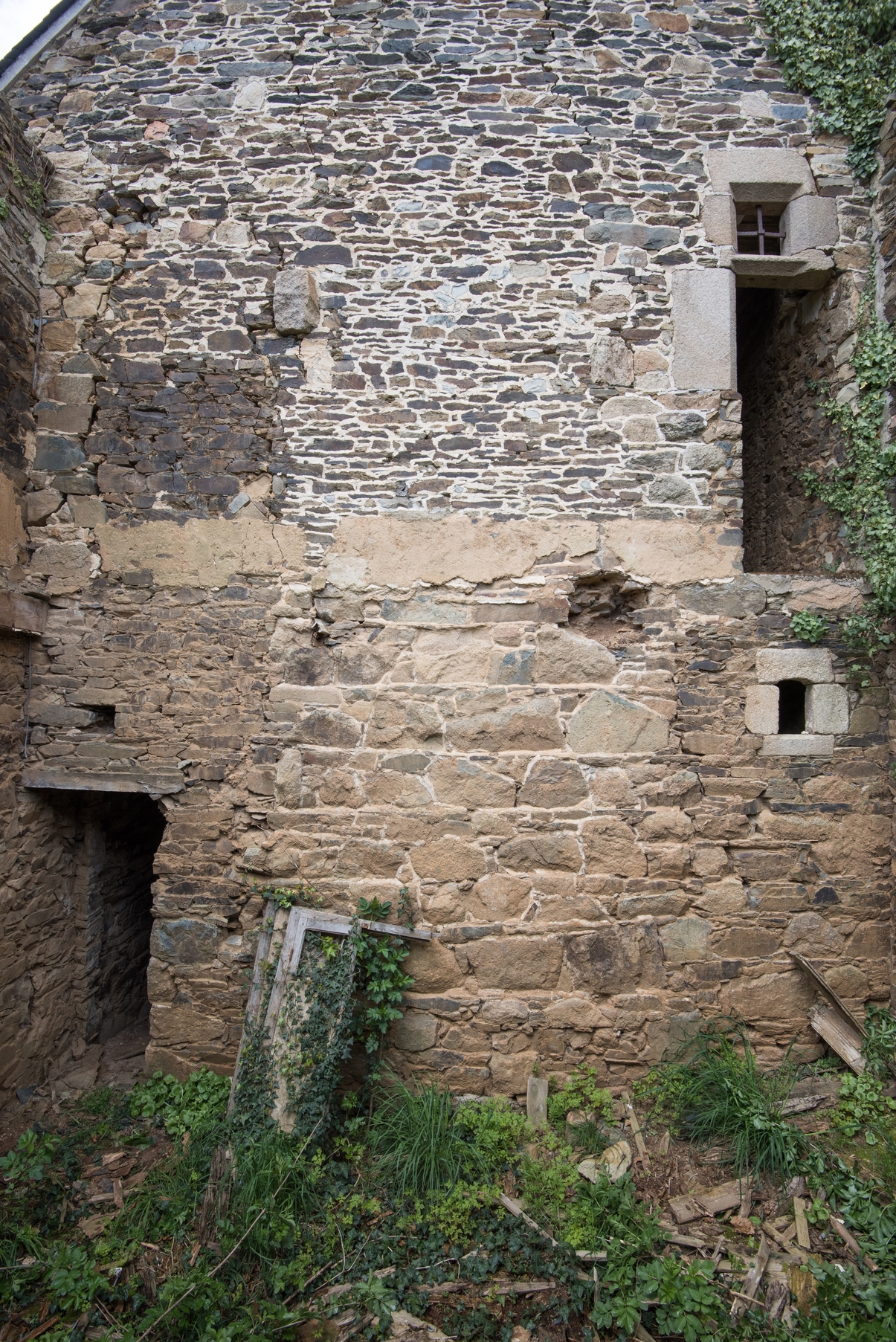 Pignon sud avec fenêtre à traverse (transformée en porte) et jour d'éclairage associé à la cheminée du rez-de-chausséeImmatriculation
