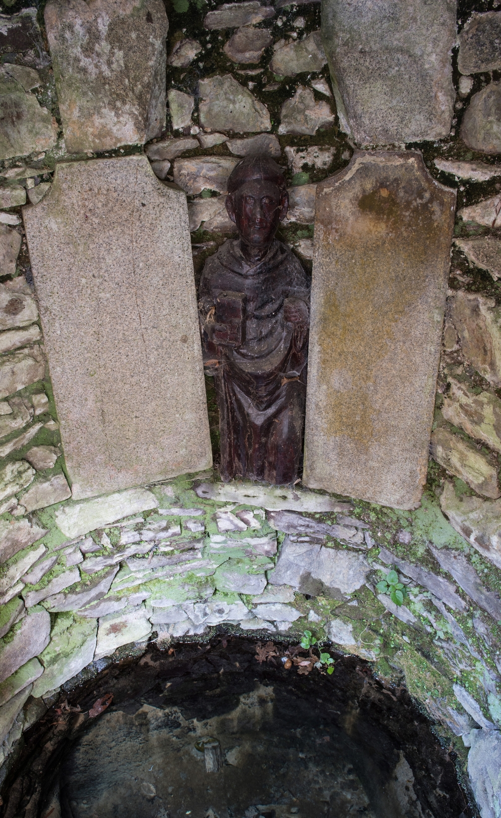 Rue de la fontaine. Fontaine de dévotion Saint-Maudez. Détail de la statue de saint MaudezImmatriculation