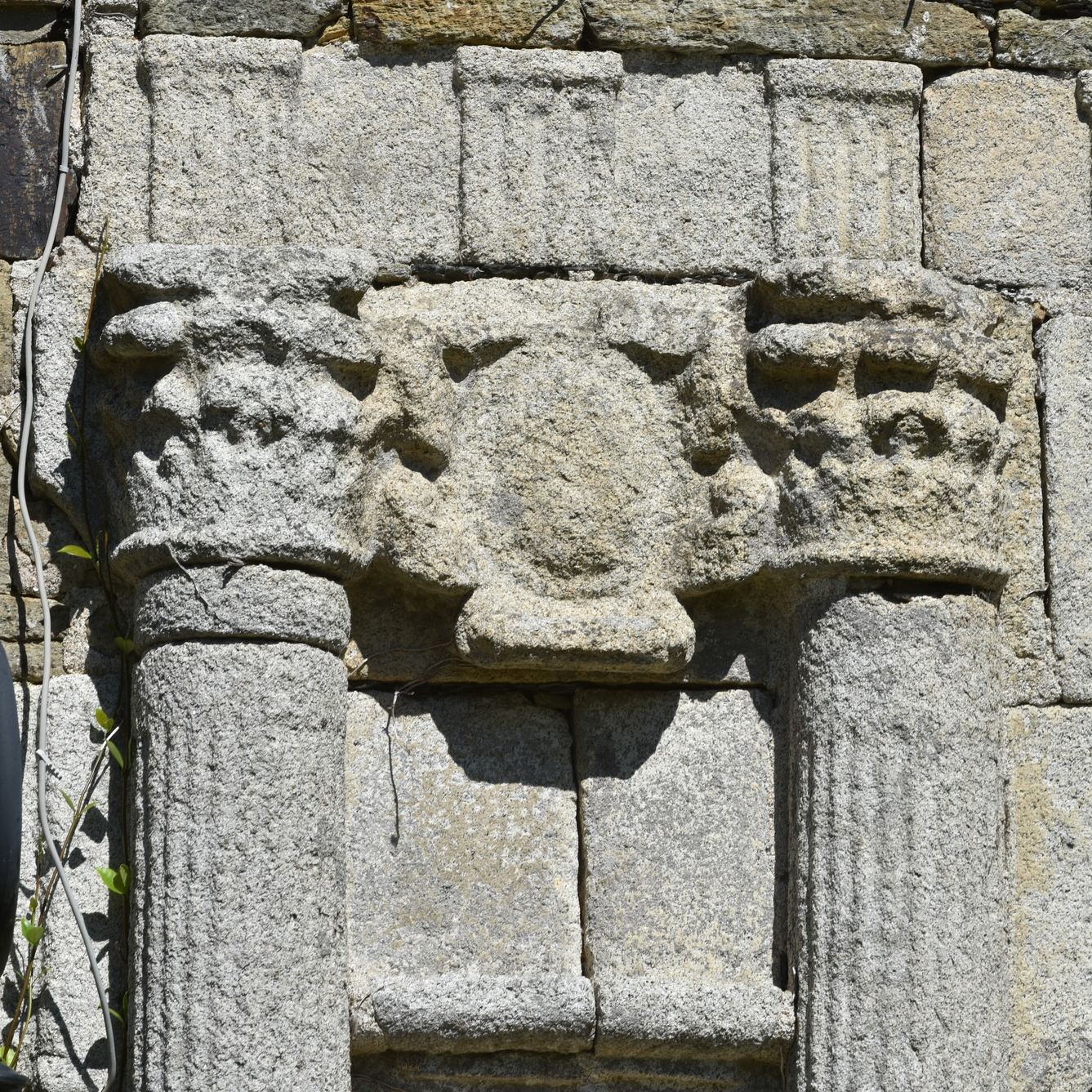 Le logis de Trostang (Camlez) - Façade sud. Portail monumental. Détail du blason entre deux chapiteaux.Immatriculation