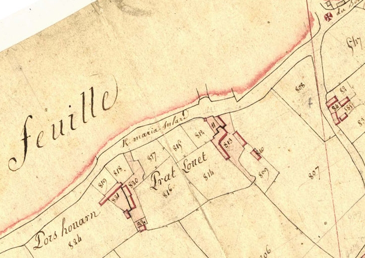 Extrait du cadastre ancien de la commune Kermaria-Sulard, 1819 : d'est en ouest, croix du boug [croix du Pavé], Prat Louet [Prat Louët] et Pors HouarnImmatriculation
